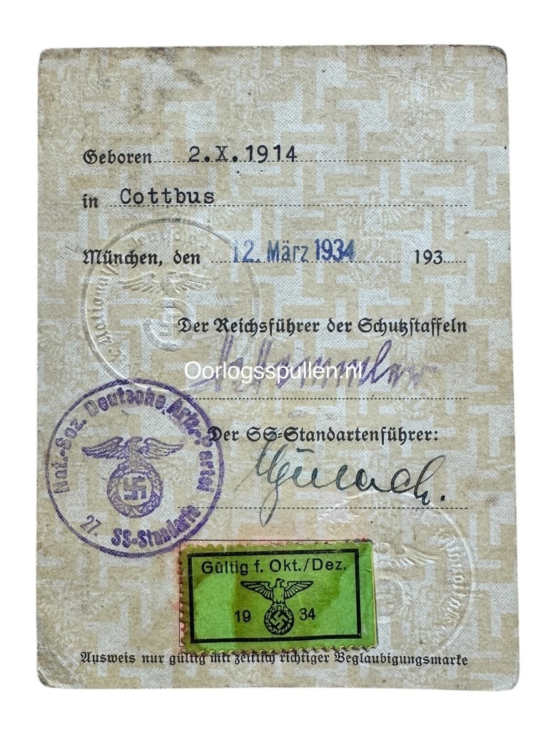Deze SS Ausweis is in goede conditie, dateert uit 1934 en is afkomstig van een lid uit Cottbus.