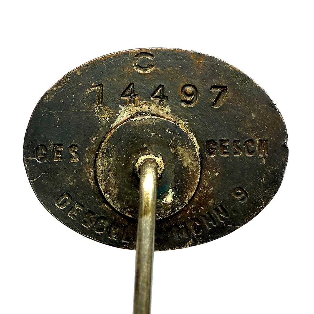 De achterzijde draagt het serienummer C 14497 en de markering GES. GESCH., wat wijst op officieel geregistreerde productie en deze speld werd geproduceerd door de fabrikant Deschler in München.