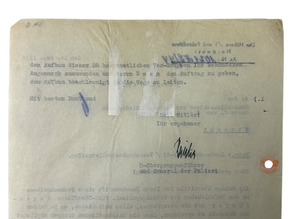 This German SS letter is in used condition and was hand-signed by the Höhere SS- und Polizeiführer Nordwest Hanns Albin Rauter.
