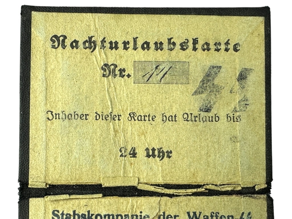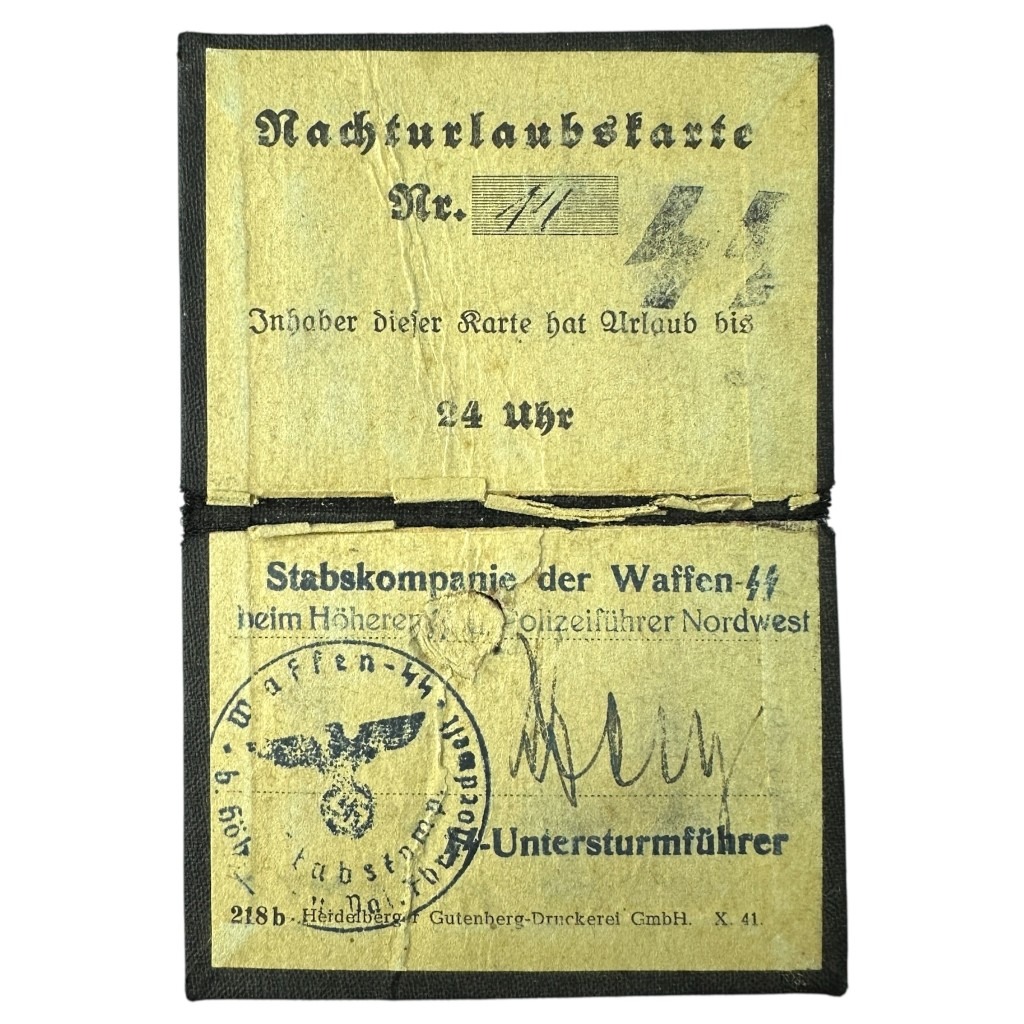 This rare SS Nachturlaubausweis (Night leave pass) is in used condition and was used by member of the Stabkompanie der Waffen-SS beim Höheren SS und Polizeiführer Nordwest in the Netherlands.