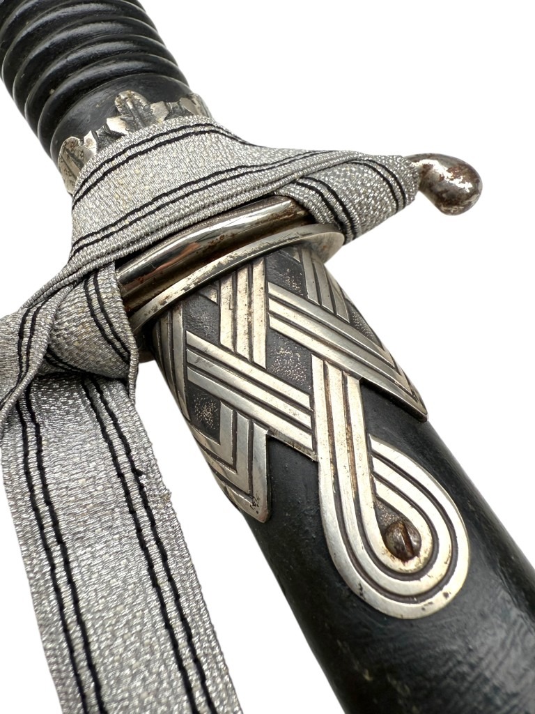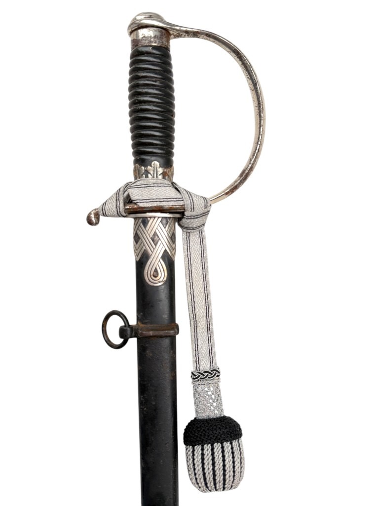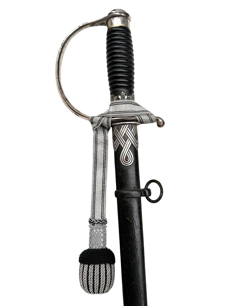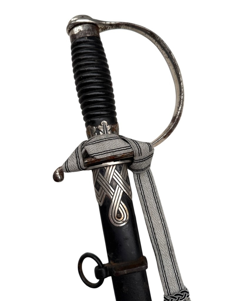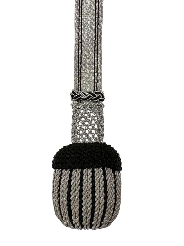 Rond het handvat is de originele zilver-en-zwarte portepee gewikkeld, wat duidt op het gebruik door SS personeel en het ceremoniële uiterlijk versterkt.
