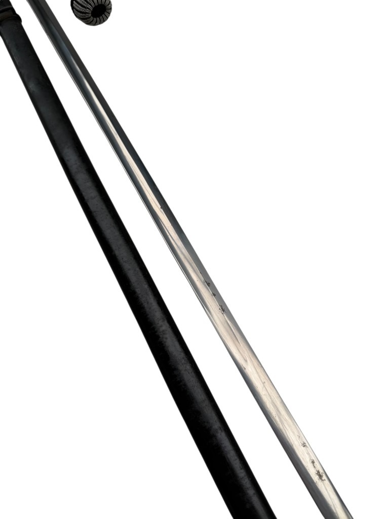 Het getoonde exemplaar heeft een zwart gelakte schede en zilverkleurig handvatbeslag en is zeer gedetailleerd.