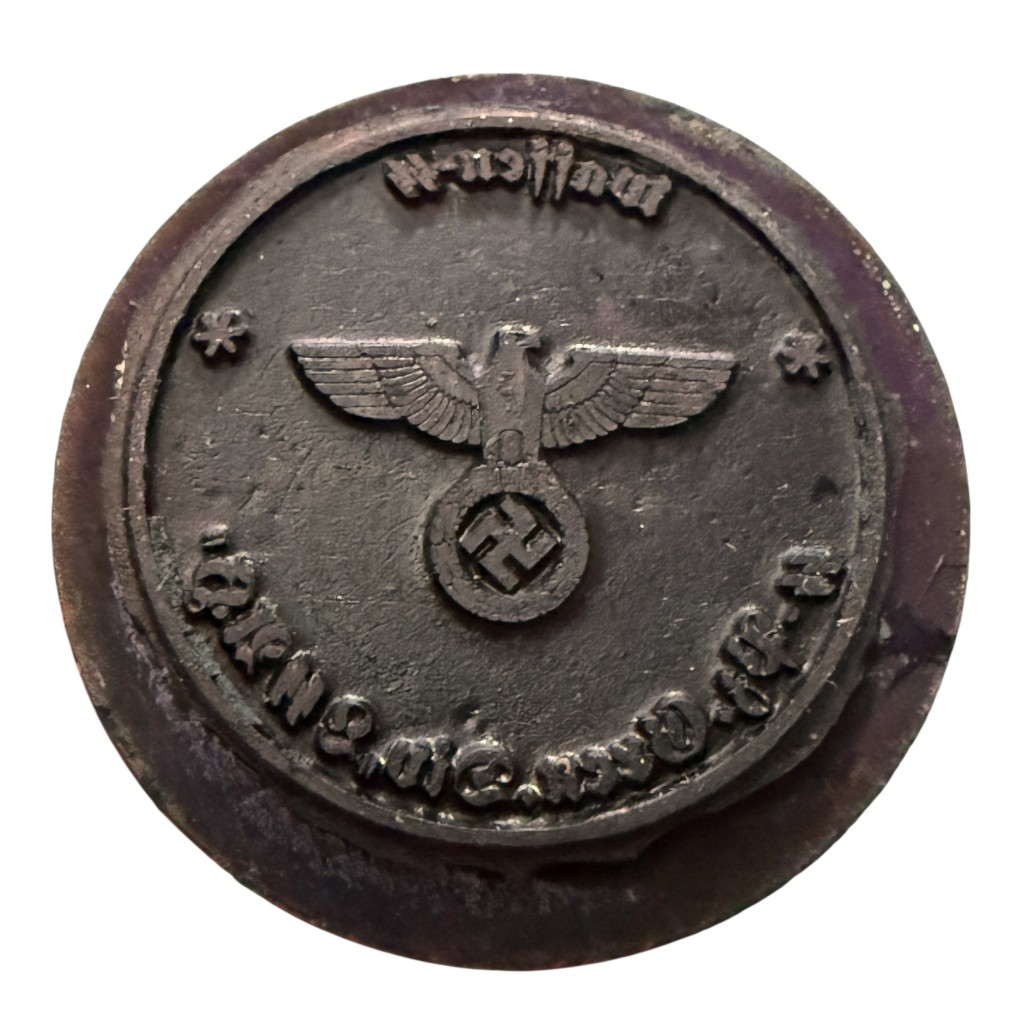 Aan de onderzijde bevindt zich de stempelplaat met het kenmerkende adelaar-embleem en opschrift, scherp en herkenbaar ondanks de tand des tijds. Dit type stempel werd gebruikt voor administratieve en logistieke doeleinden binnen de eenheid Een interessant object voor de militaria of Tweede Wereldoorlog collectie!