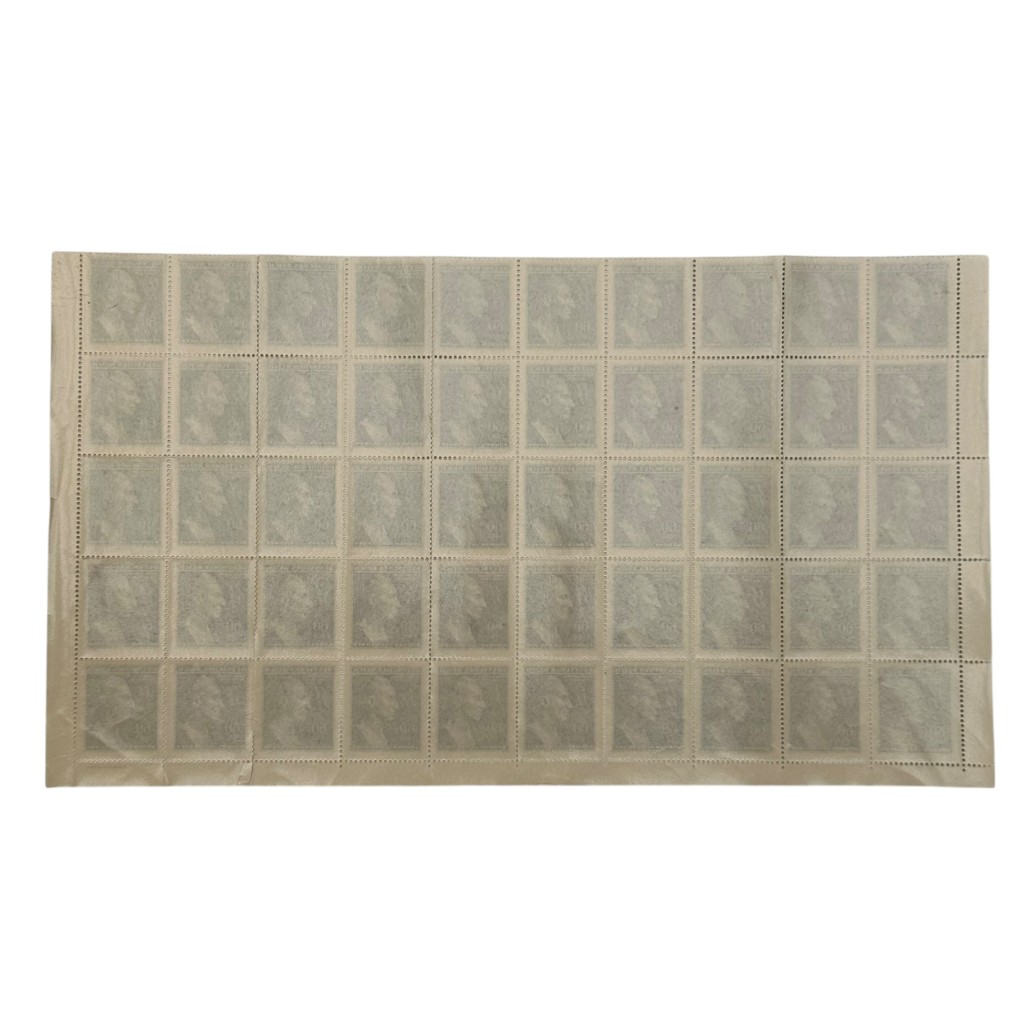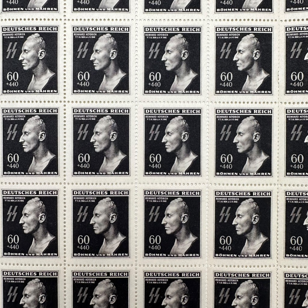 Original sheet with 50 postage stamps (5 rows of 10) from the Deutsches Reich, issued in commemoration of Reinhard Heydrich (1904–1942).