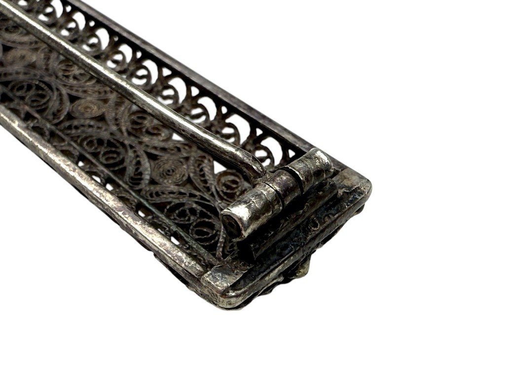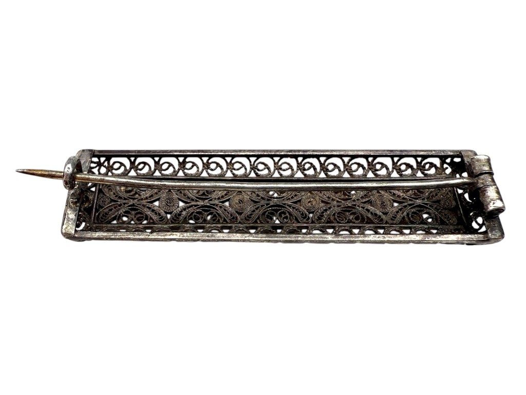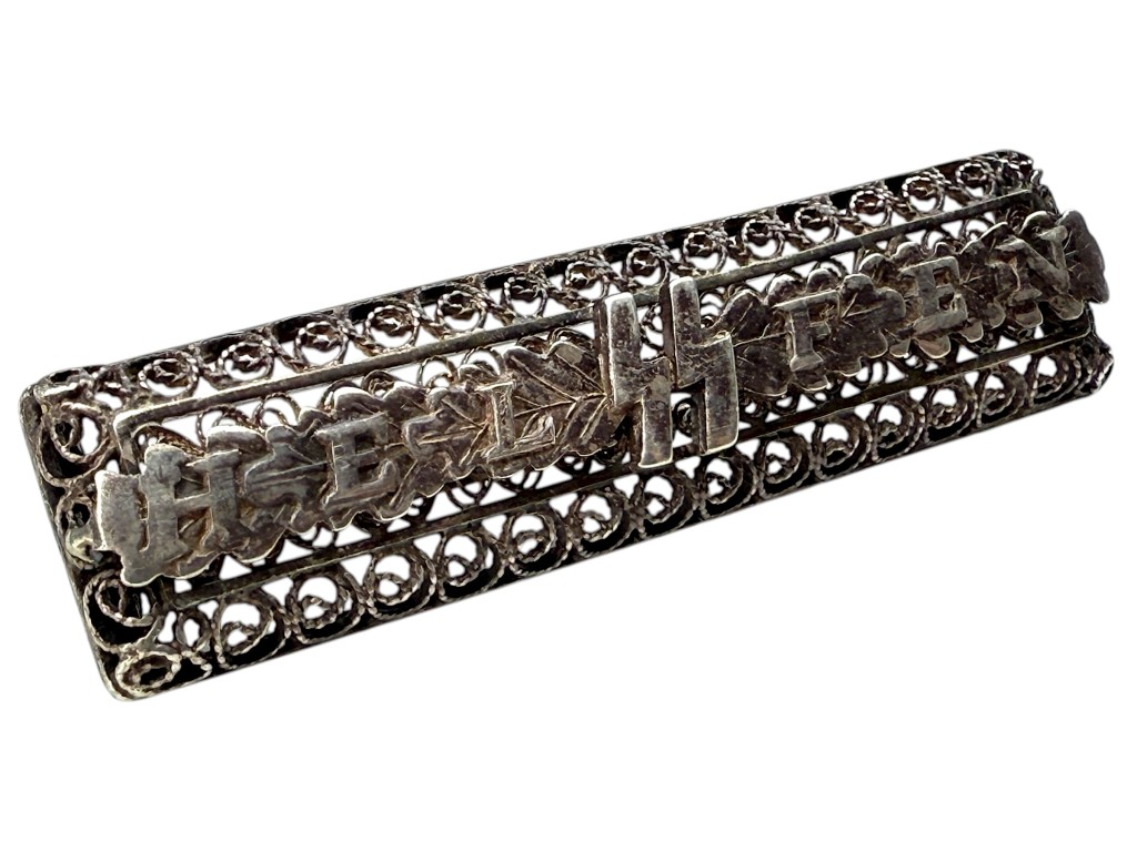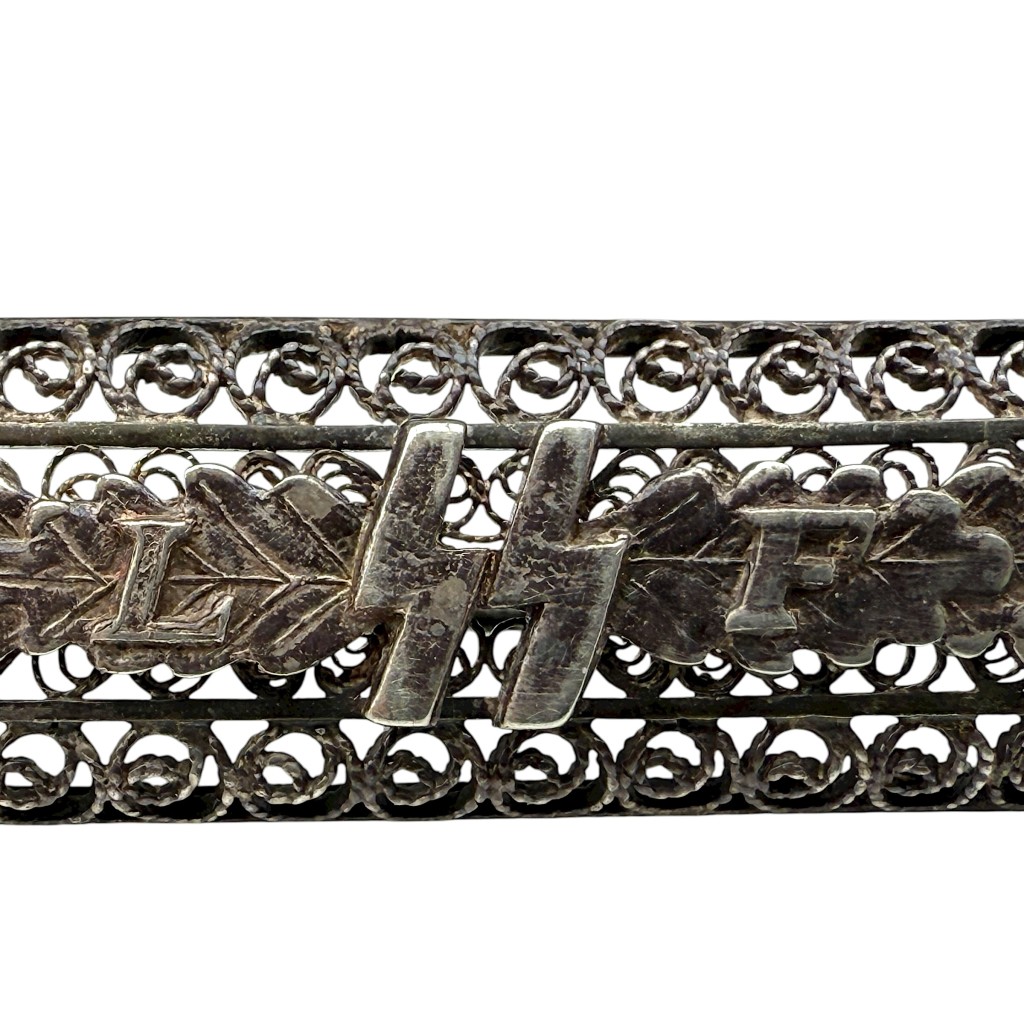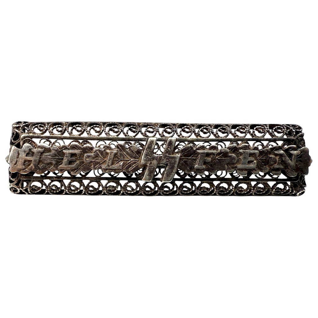 Deze zilveren vrouwen-SS “Helfen” broche uit de Tweede Wereldoorlog is een bijzonder en verfijnd exemplaar, waarbij de originele SS Helfen speld is bevestigd op een gepersonaliseerde opengewerkte zilverfiligraan drager.