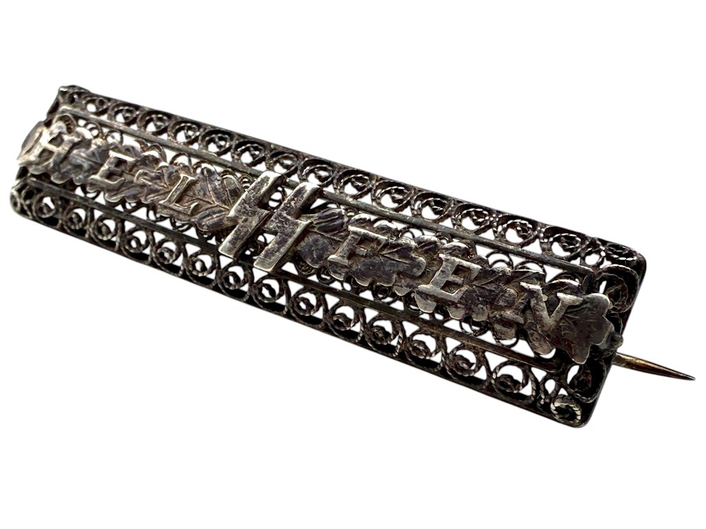 The brooch displays the Helfen text with its characteristic runes set between finely detailed oak leaves, while the surrounding filigree body consists of meticulously hand-formed silver wire patterns that give the piece its elegant and unique appearance.