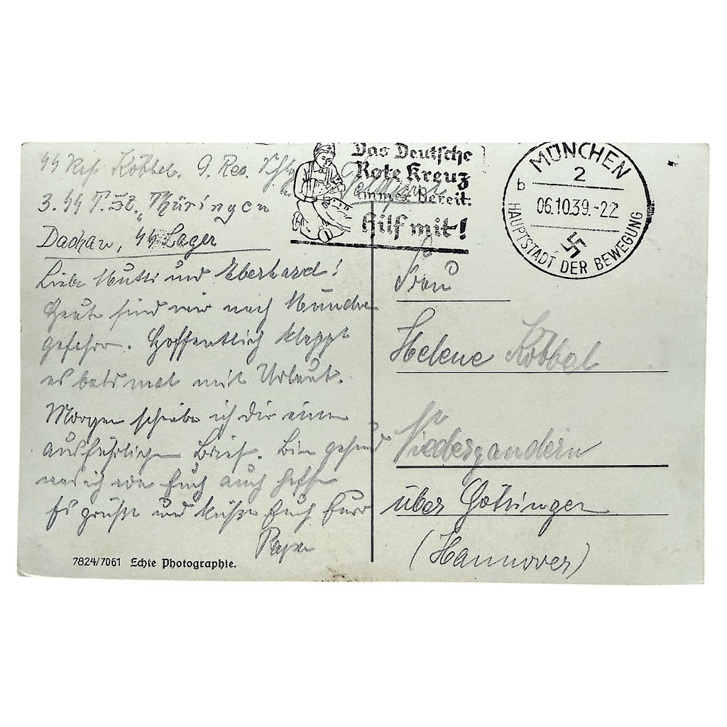 Original SS Feldpost postcard sent by SS-Rottenführer Köbbel who was stationed in 1939 at SS-Lager Dachau, mailed from Munich on 6 October 1939.
