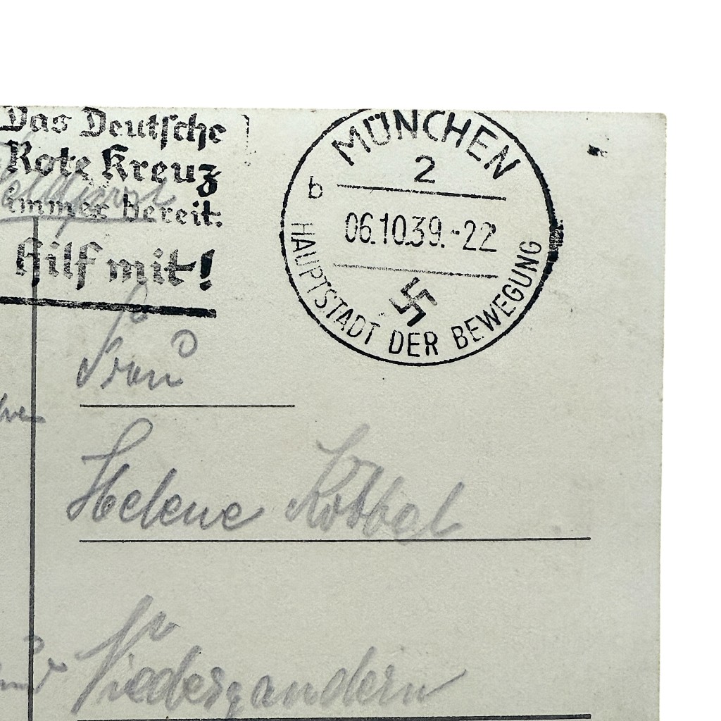 The card was sent through the postal system and bears a clearly legible cancellation “MÜNCHEN 2 – Hauptstadt der Bewegung”, as well as the characteristic Red Cross motif on the card side.