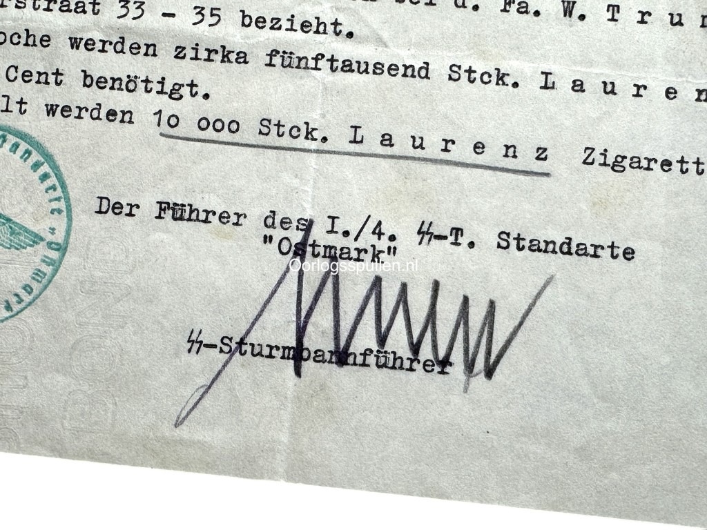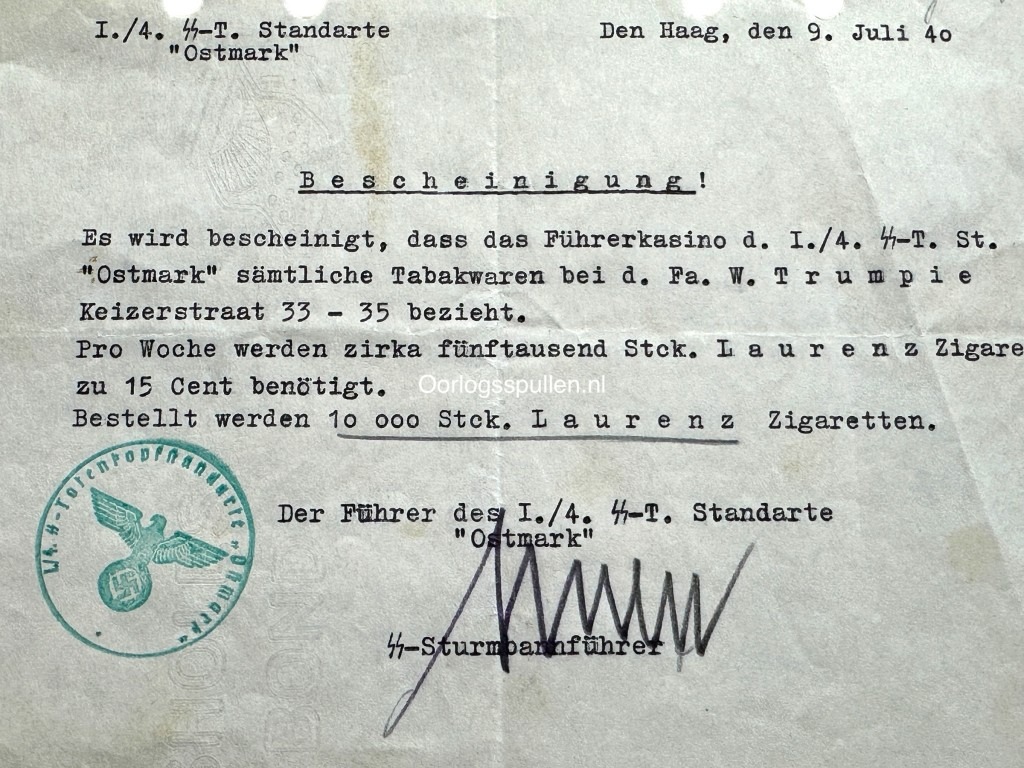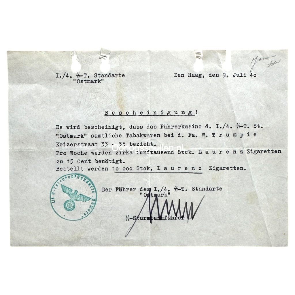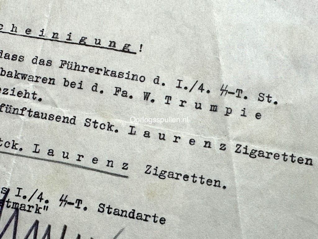 Es wird bescheinigt, dass das Führerkasino d. I./4. SS-T. St. „Ostmark“ sämtliche Tabakwaren bei d. Fa. W. Trumpie