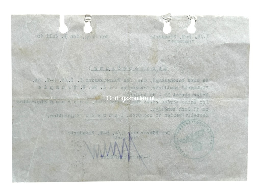 Dit Duitse SS-Totenkopf document is in gebruikte conditie, dateert van 9 juli 1940 en was afkomstig uit Den Haag.