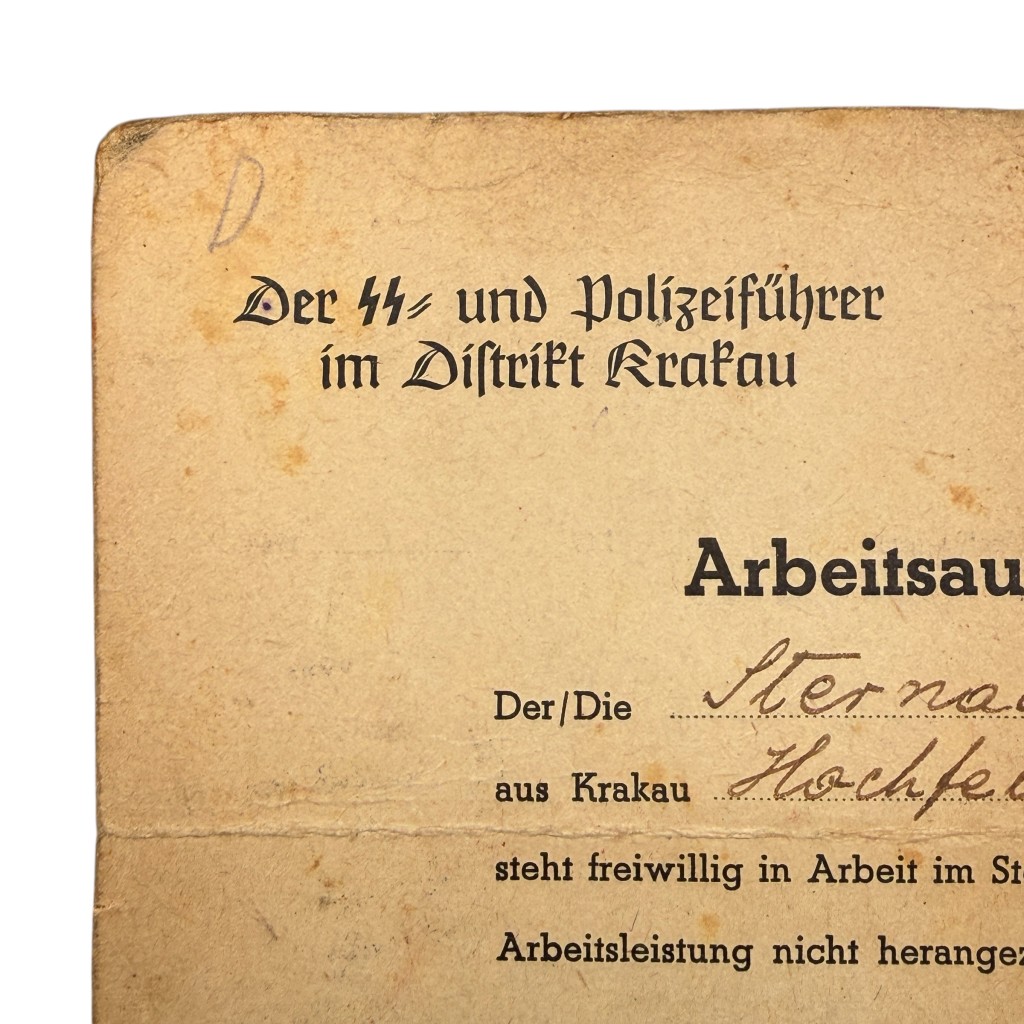 Originele WWII Duitse SS- und Polizeiführer im Distrikt Krakau Arbeitsausweis Krakau in Polen 1944