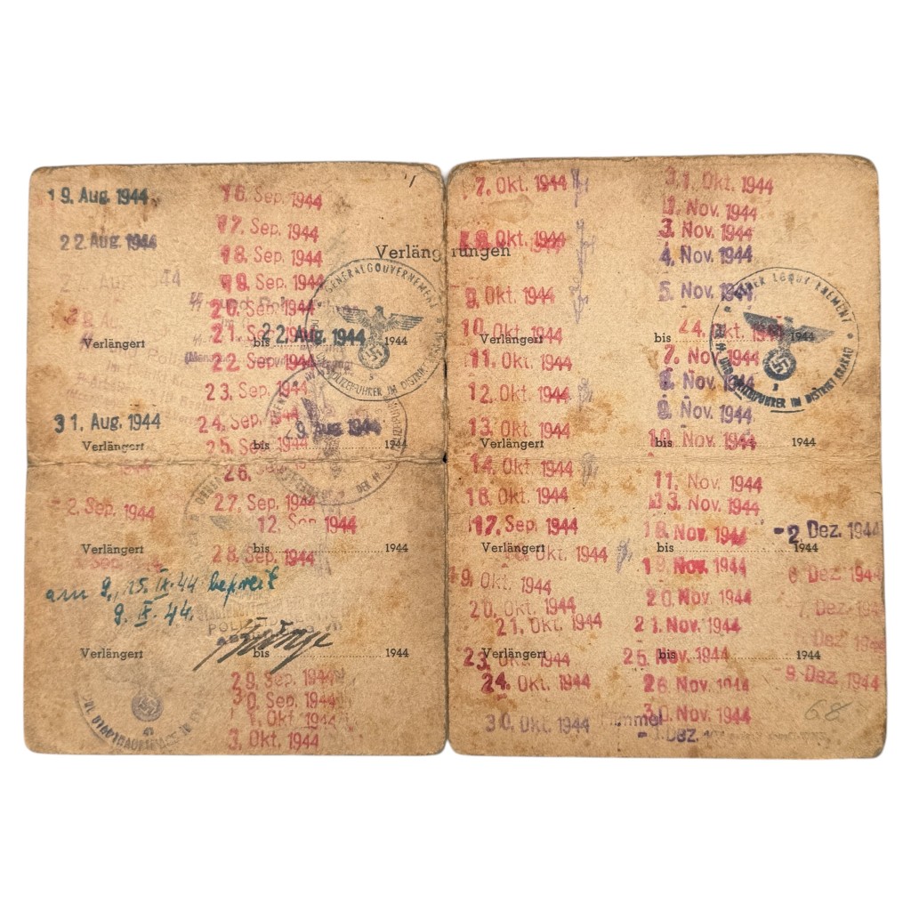 Original German Arbeitsausweis issued in Krakow on August 9, 1944 during the Second World War.