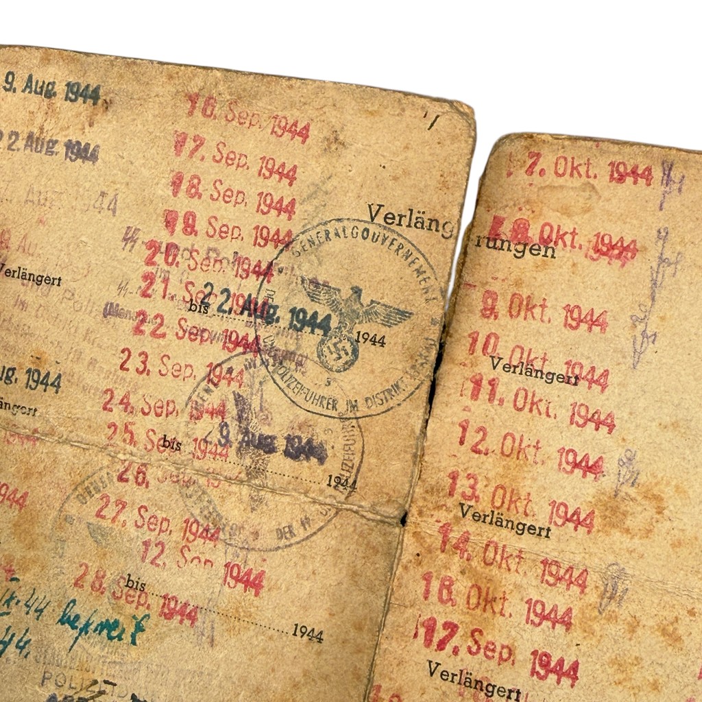Originele Duitse Arbeitsausweis uitgegeven in Krakau op 9 augustus 1944 tijdens de Tweede Wereldoorlog.