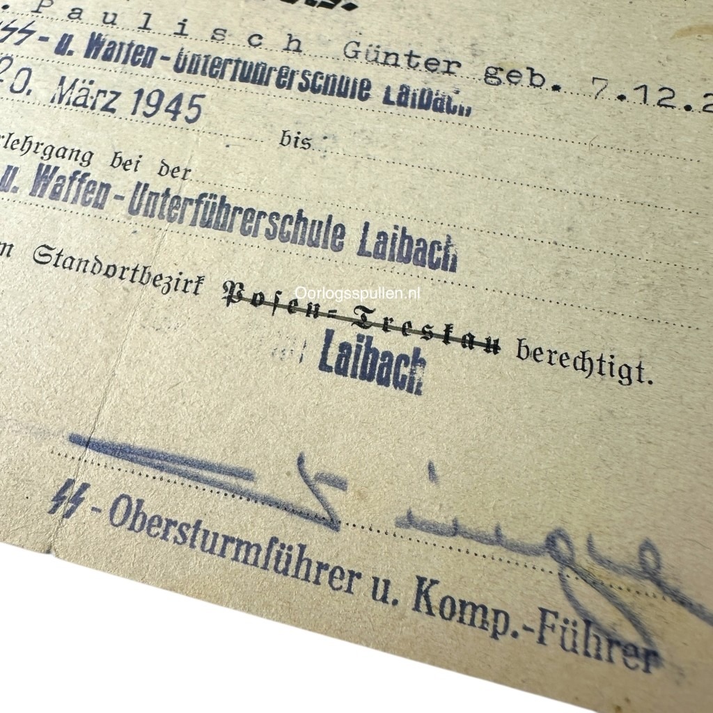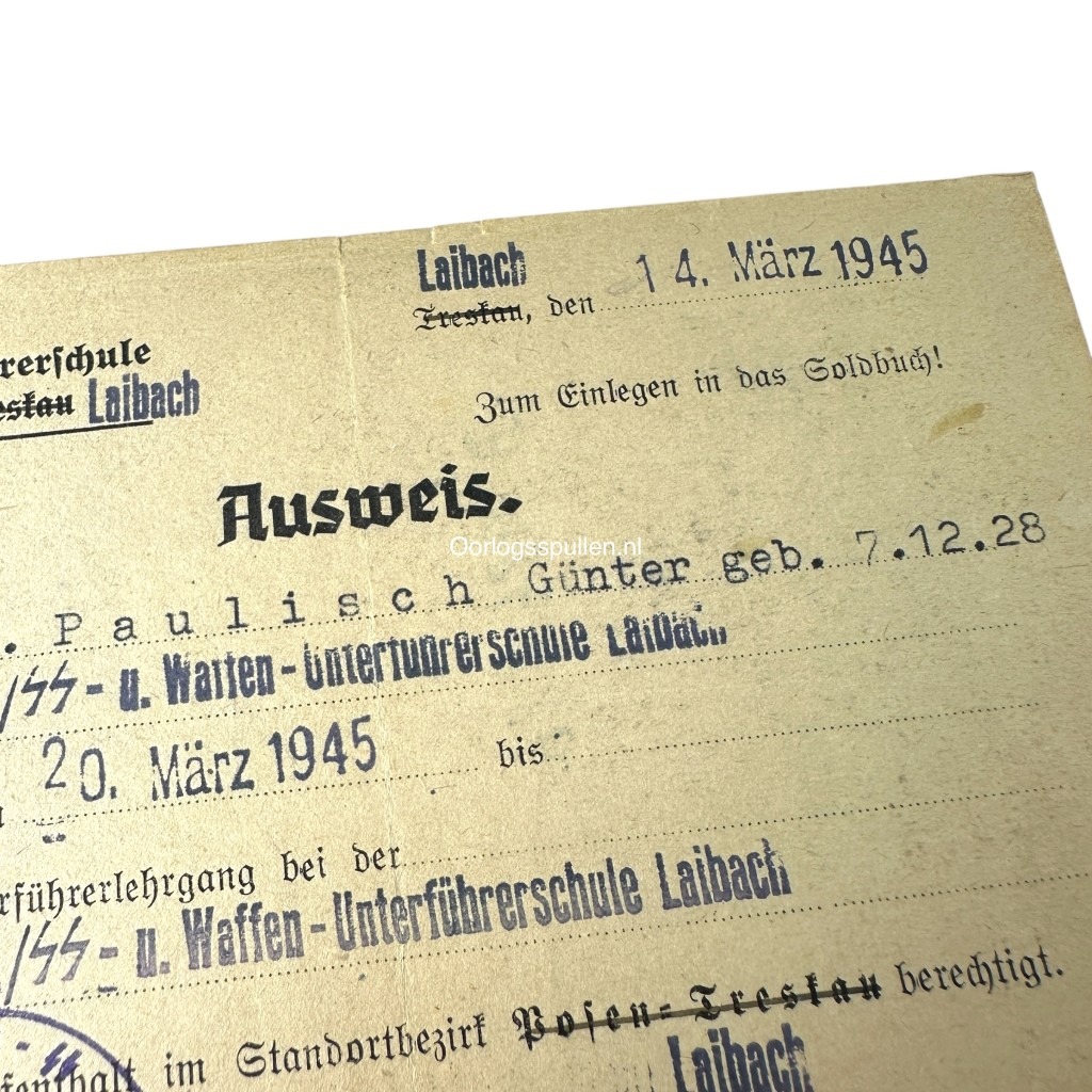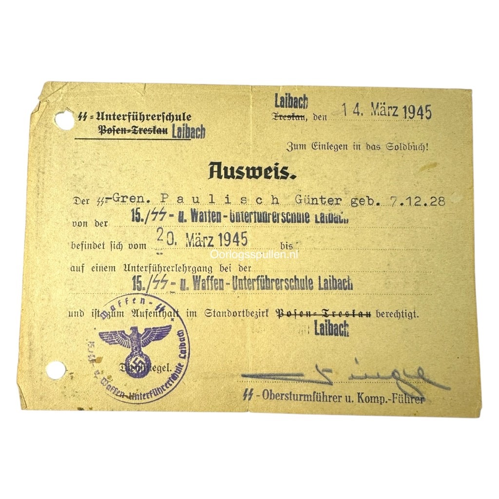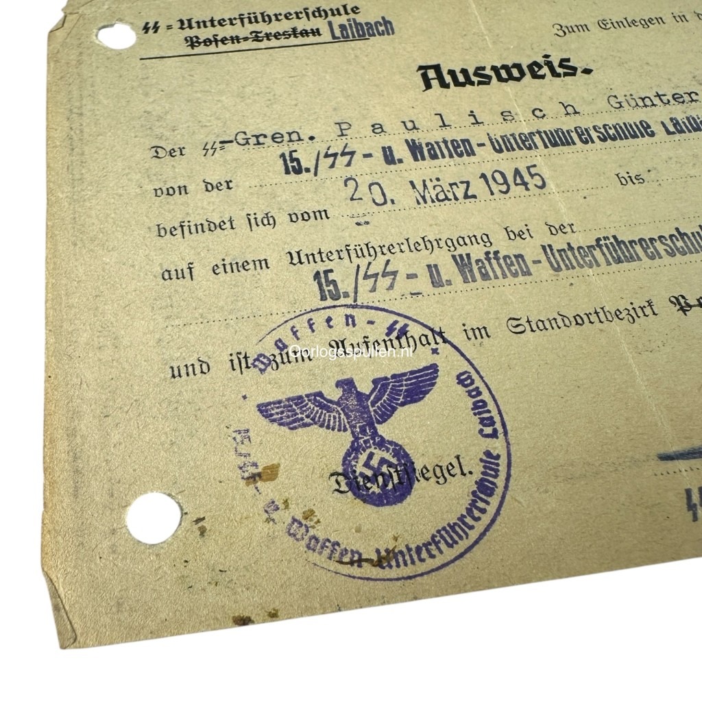 This German SS-Unterführerschule Laibach Ausweis is in good condition and belonged to SS-Grenadier Günther Paulisch who was trained in March 1945 at the 15./SS und Waffen-Unterführerschule Laibach.