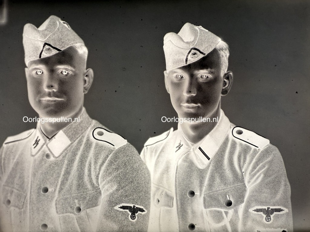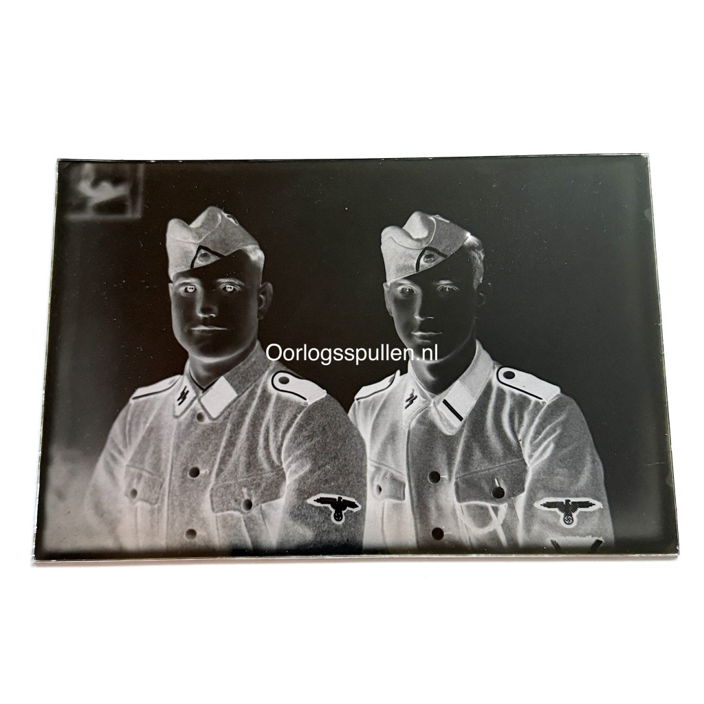 Dit ongepubliceerde glasnegatief uit de Tweede Wereldoorlog toont een zorgvuldig gecomponeerd studioportret van twee Waffen-SS soldaten van de SS-Verfügungstruppe (SS-VT). Beide militairen zijn afgebeeld in uniform met veldmuts, duidelijk herkenbare kraagspiegels en mouwadelaars, waarbij de verschillen in rang subtiel zichtbaar zijn. De soldaten zijn frontaal en halfzijdig gepositioneerd, wat het portret een formeel en evenwichtig karakter geeft. De opname is scherp en rijk aan detail, met een heldere weergave van gelaatstrekken, uniformknopen en stofstructuren, typerend voor professionele portretfotografie uit deze periode. Het betreft een origineel fotografisch negatief op glas, een kwetsbaar maar hoogwaardig medium dat in de jaren dertig en veertig veel werd gebruikt voor officiële en atelieropnamen. Een bijzonder en zeldzaam object voor verzamelaars, musea en onderzoekers met een specifieke interesse in Duitse militaire fotografie, de SS-VT en de geschiedenis van de Tweede Wereldoorlog.