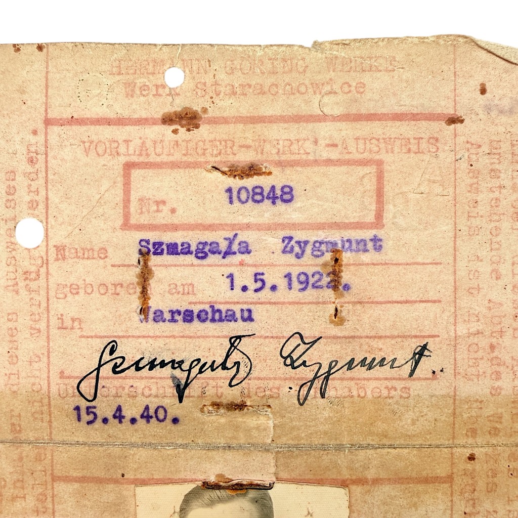 This original Vorläufiger Werks-Ausweis No. 10848 is a German provisional factory and work identification pass from 1940, issued by Reichswerke A.G. “Hermann Göring” – Werk Starachowice (Oberwerk). The document is made out in the name of Zygmunt Sznagajła, born on May 1, 1922, in Warsaw, and was stamped on April 15, 1940; the pass includes a portrait photograph, the holder’s signature, and official factory stamps from the plant in Starachowice.