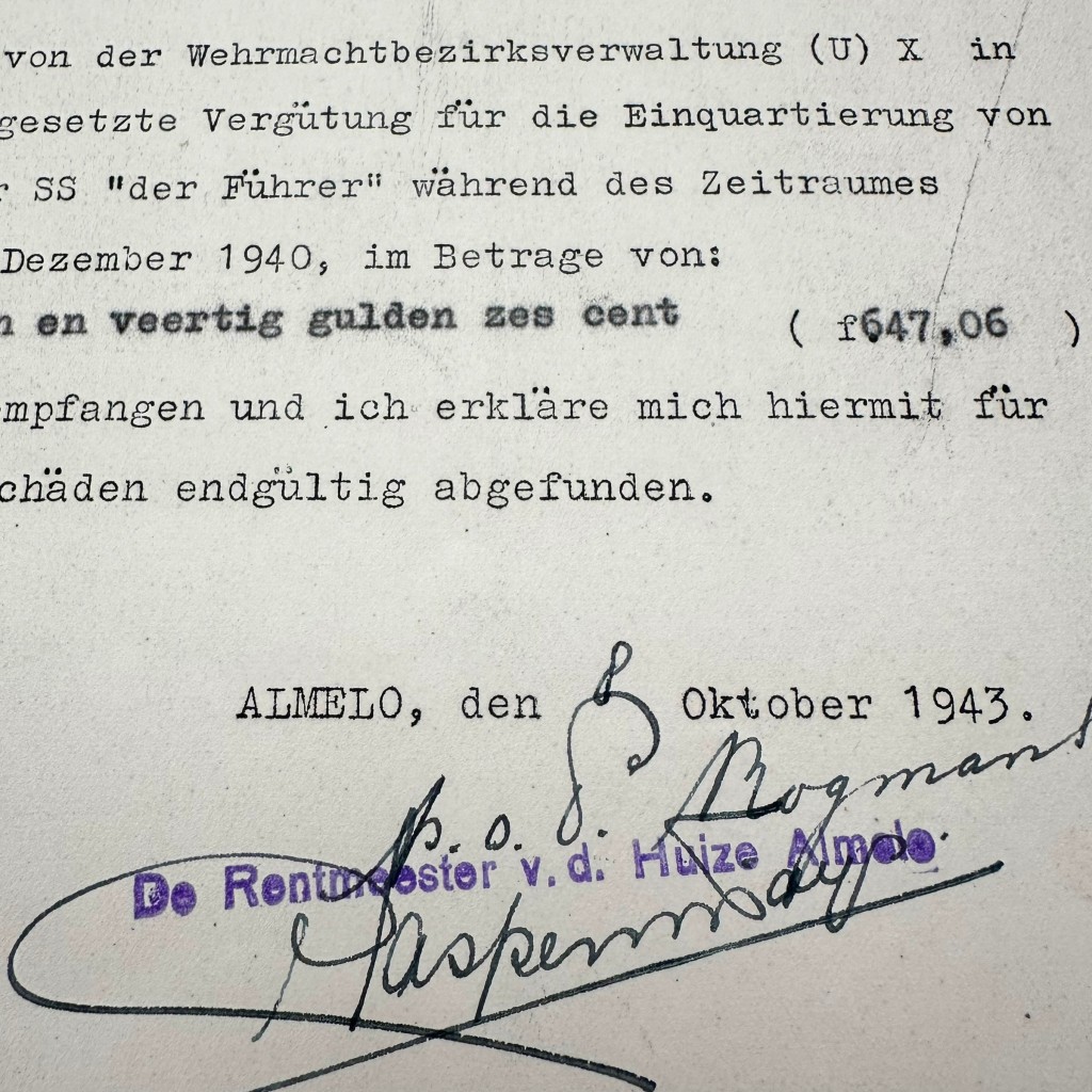 Origineel Duits document uit de Tweede Wereldoorlog, getiteld “Erklärung”, gedateerd Almelo, 6 oktober 1943. In deze verklaring wordt bevestigd dat de door de Wehrmachtbezirksverwaltung (U) X te Groningen vastgestelde vergoeding voor de inkwartiering van leden van de SS “Der Führer” over de periode 15 juli tot 14 december 1940 is ontvangen. Het bedrag van 647,06 gulden wordt expliciet vermeld, waarna de ontvanger verklaart hiermee volledig schadeloos te zijn gesteld voor eventuele verdere schade. Het document is afkomstig van Schloss “Almelo”, Gemeentelice in Almelo, en draagt een handgeschreven handtekening en stempel van “De Rentmeester v.d. Huize Almelo”. Een historisch document dat inzicht geeft in de administratieve afhandeling van inkwartiering van Duitse troepen in bezet Nederland tijdens de oorlogsjaren.