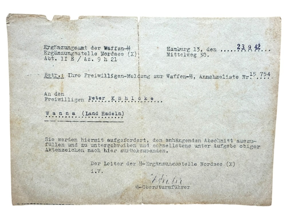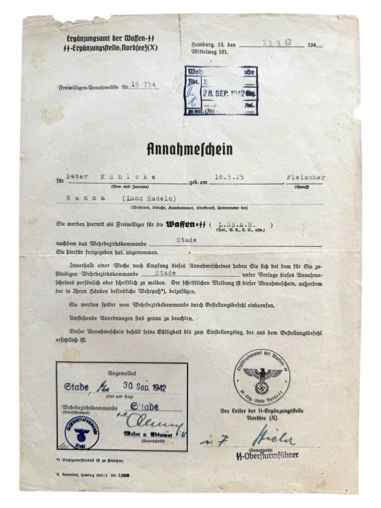 Deze Duitse Waffen-SS aanmeldingsdocumenten zijn in gebruikte conditie en behoorde tot Peter Kühlcke uit Wanna welke zich aanmeldde als vrijwilliger voor de 1. SS-Panzer-Division Leibstandarte-SS Adolf Hitler.