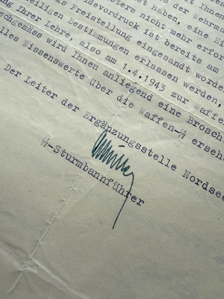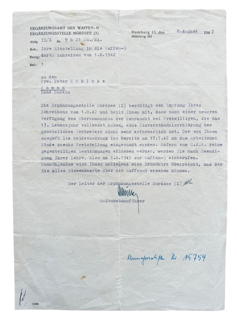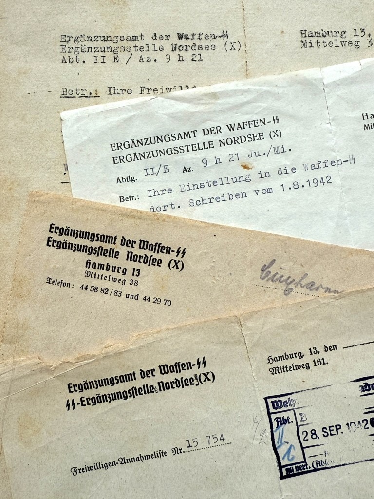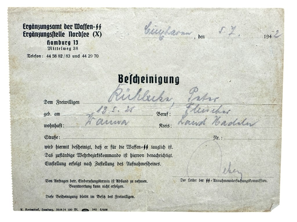 He registered in 1942 with the Ergänzungsamt der Waffen-SS – SS-Ergänzungstelle Nordsee (X).