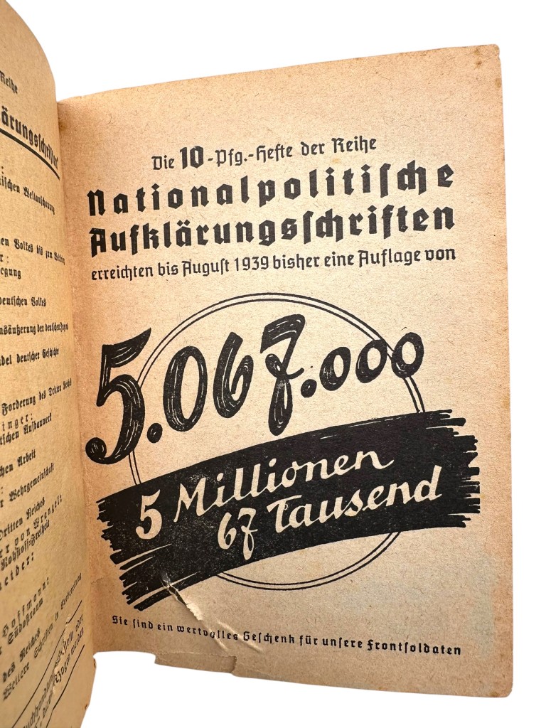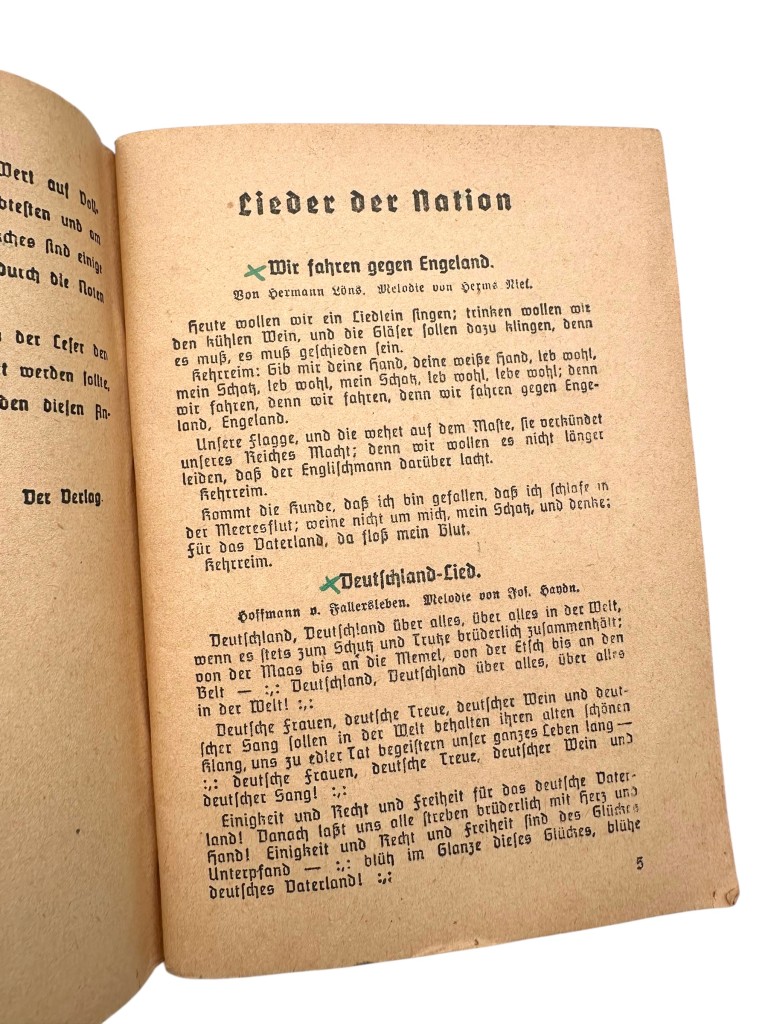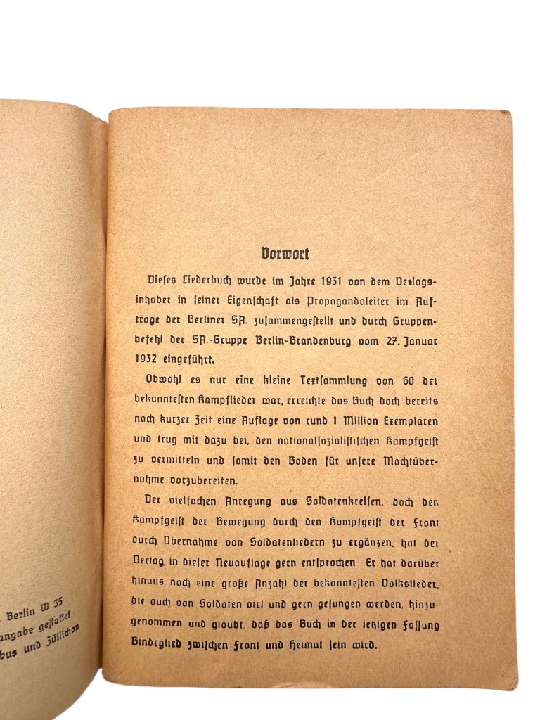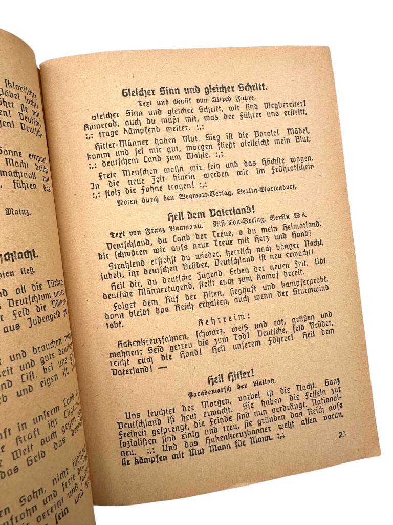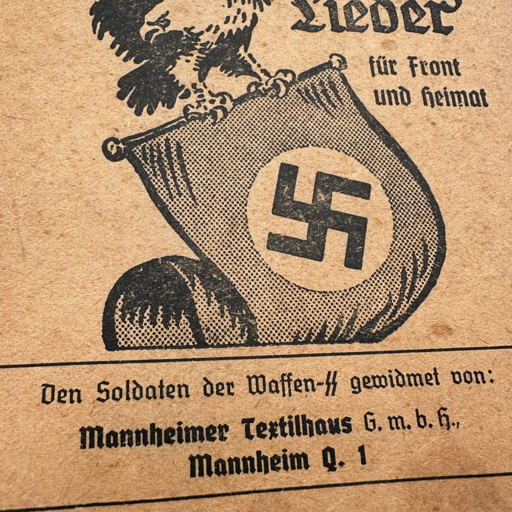 This compact songbook contains various battle and marching songs intended for use both at the front and on the home front, as indicated on the title page “für Front und Heimat” (for front and homeland). This particular example originated from a soldier of the SS-Infanterie Ersatz Bataillon “Germania”, a training and replacement battalion of the Waffen-SS, which is confirmed by the Waffen-SS stamp inside the booklet.
