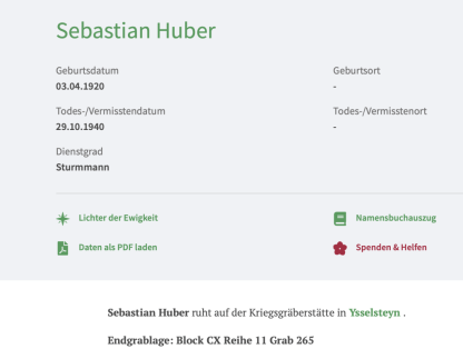 Sebastian Huber’s grave can be found today on the German military cemetery in Ysselsteyn.
