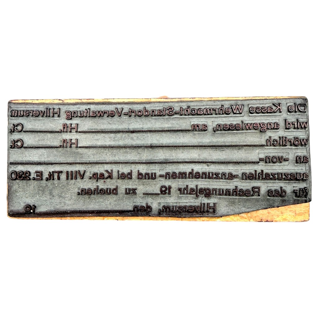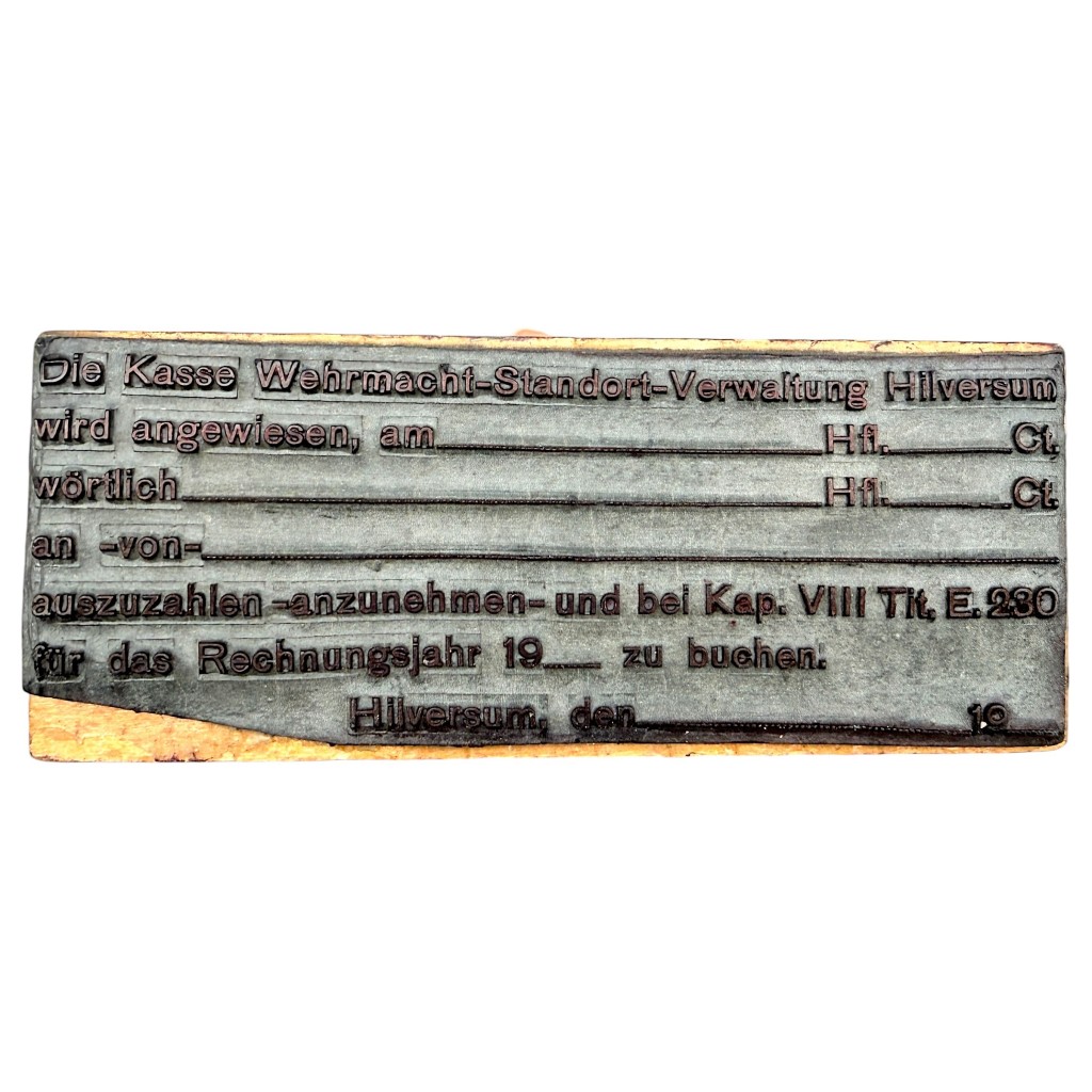 De stempel bevat uitgebreide administratieve tekst zoals “Die Kasse Wehrmacht-Standort-Verwaltung Hilversum wird angewiesen” en werd gebruikt voor financiële verwerking binnen de Wehrmacht.