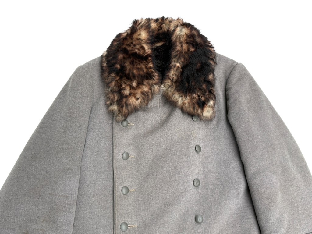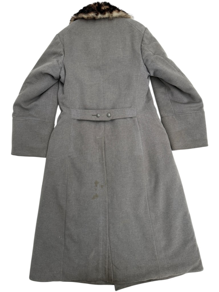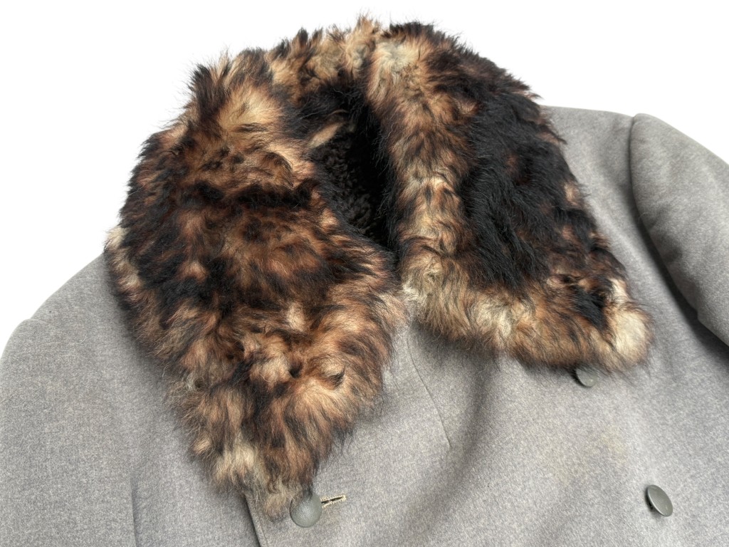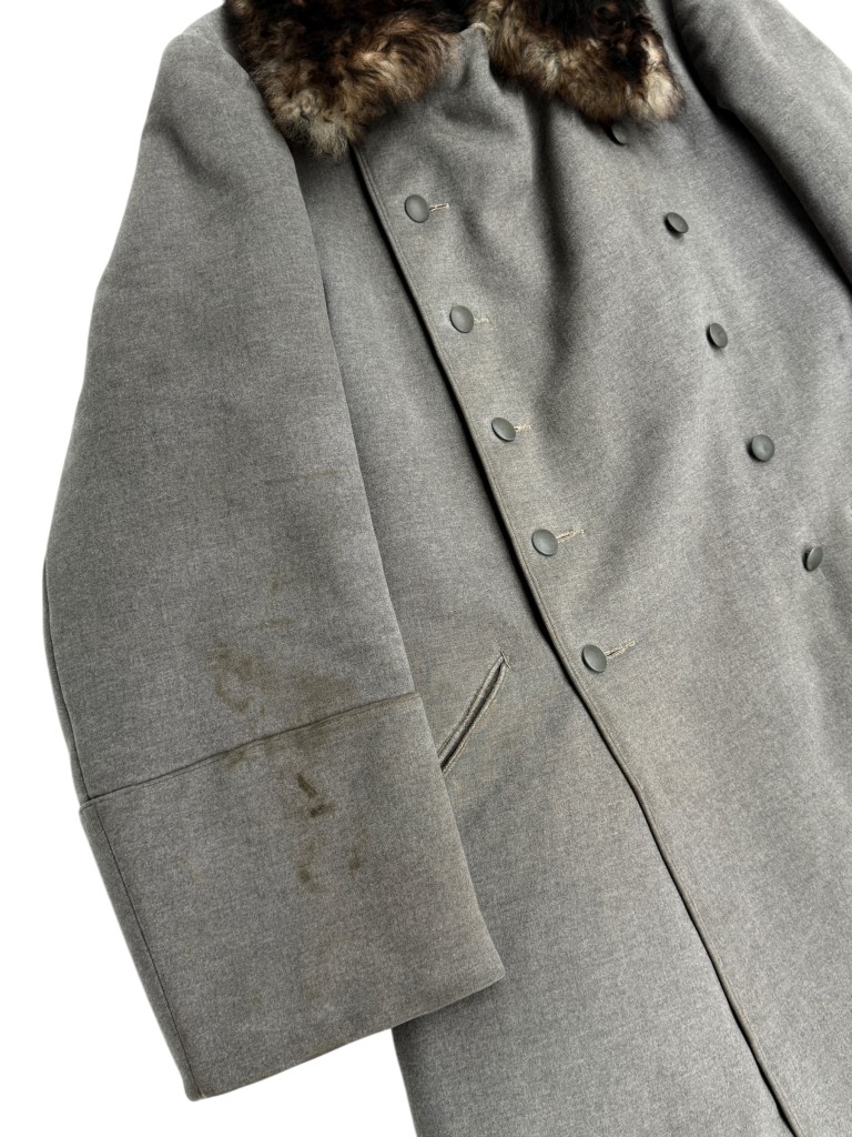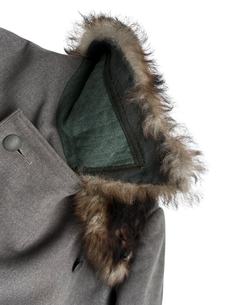 Deze Duitse Wehrmacht officiers wintermantel uit de Tweede Wereldoorlog is uitgevoerd in veldgrijze wol en voorzien van een karakteristieke dubbelrijige knopenrij met grijsgroene, gestippelde metalen knopen. De kraag is afgewerkt met een brede rand van natuurlijk bont, ontworpen voor extra bescherming tegen extreme kou aan het oostelijke en noordelijke front. De binnenzijde van de mantel is volledig gevoerd met een zware zwarte schapenvachtvoering, die zowel warmte-isolatie als structurele stevigheid biedt. Aan de achterzijde bevindt zich een traditionele ceintuurband met twee knopen en een diepe rugsplit voor betere bewegingsvrijheid. De manchetten zijn verstevigd en uitgevoerd in hetzelfde veldgrijze wol. Een interessante jas voor verzamelaars van winterkleding binnen de Duitse Wehrmacht!