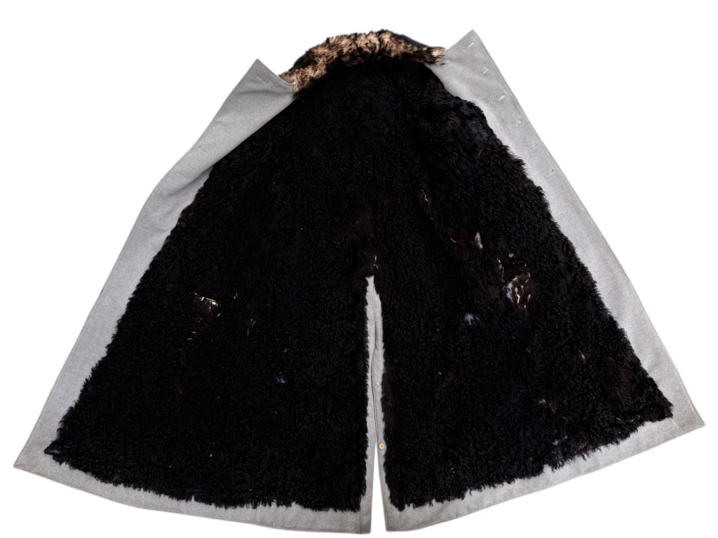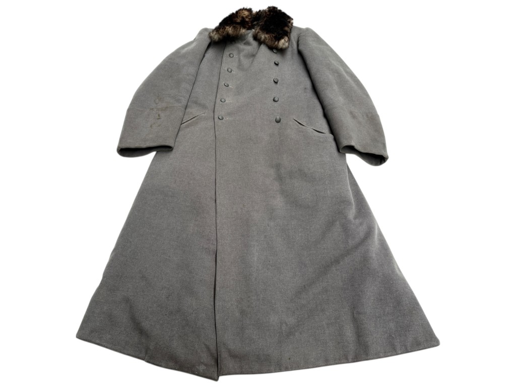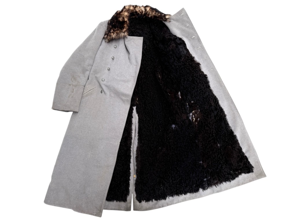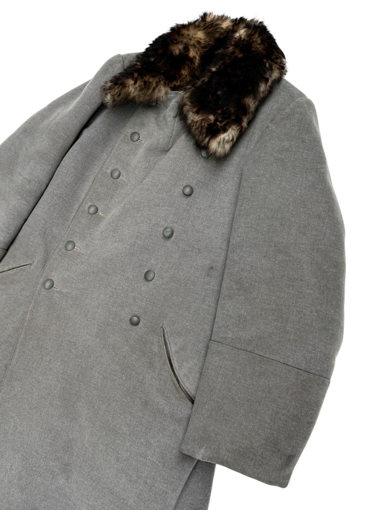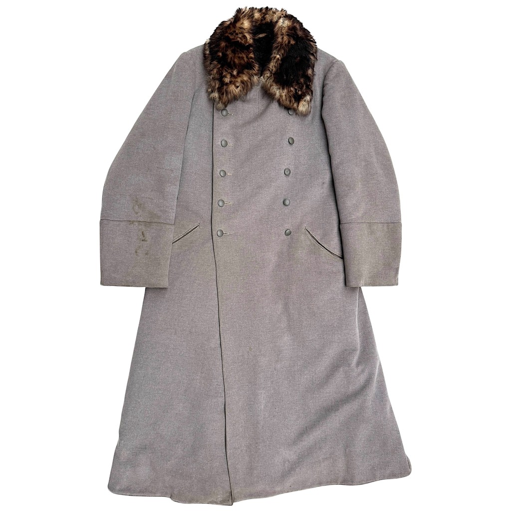 Deze Duitse Wehrmacht officiers wintermantel uit de Tweede Wereldoorlog is uitgevoerd in veldgrijze wol en voorzien van een karakteristieke dubbelrijige knopenrij met grijsgroene, gestippelde metalen knopen. De kraag is afgewerkt met een brede rand van natuurlijk bont, ontworpen voor extra bescherming tegen extreme kou aan het oostelijke en noordelijke front. De binnenzijde van de mantel is volledig gevoerd met een zware zwarte schapenvachtvoering, die zowel warmte-isolatie als structurele stevigheid biedt. Aan de achterzijde bevindt zich een traditionele ceintuurband met twee knopen en een diepe rugsplit voor betere bewegingsvrijheid. De manchetten zijn verstevigd en uitgevoerd in hetzelfde veldgrijze wol. Een interessante jas voor verzamelaars van winterkleding binnen de Duitse Wehrmacht!