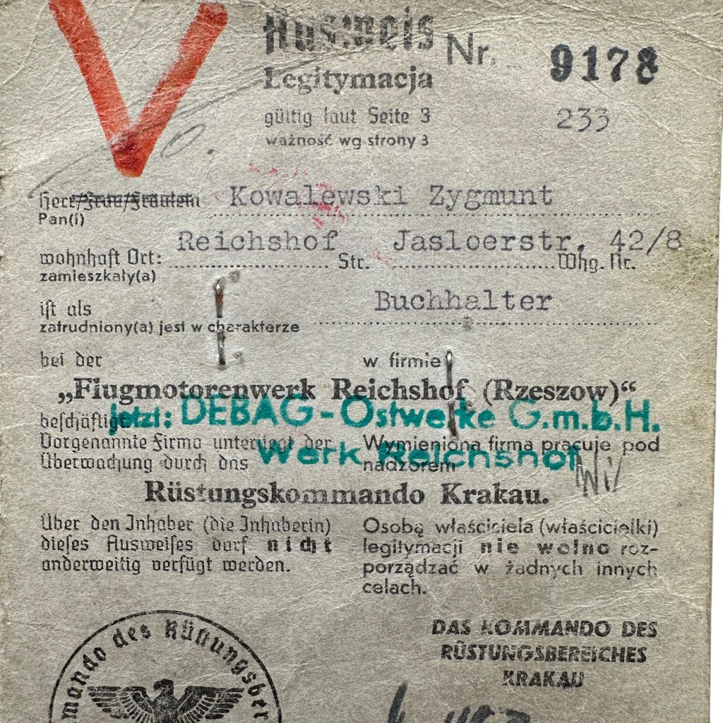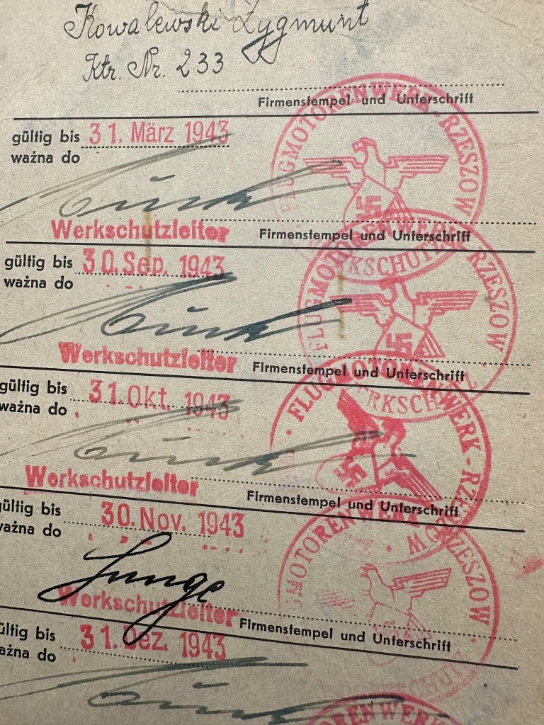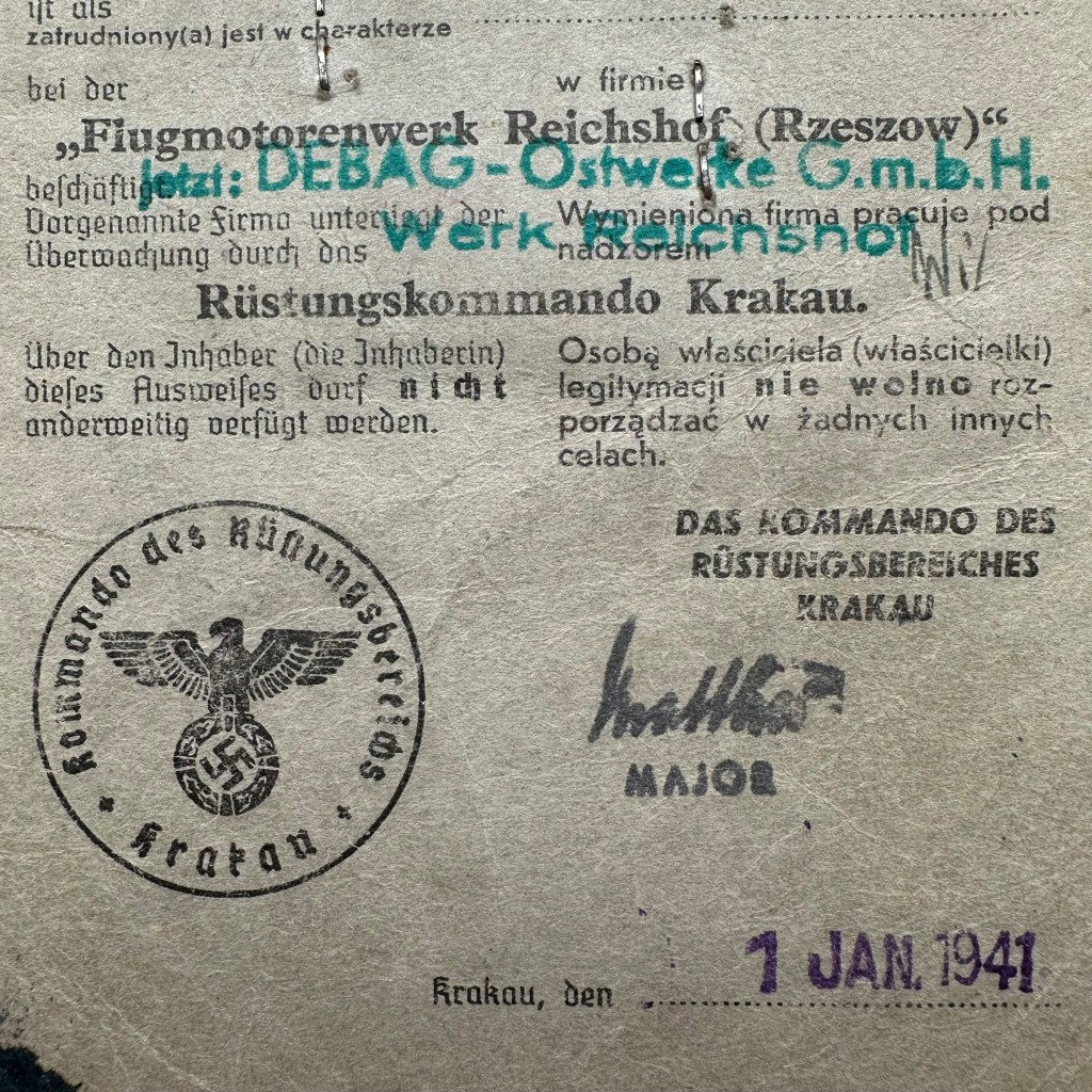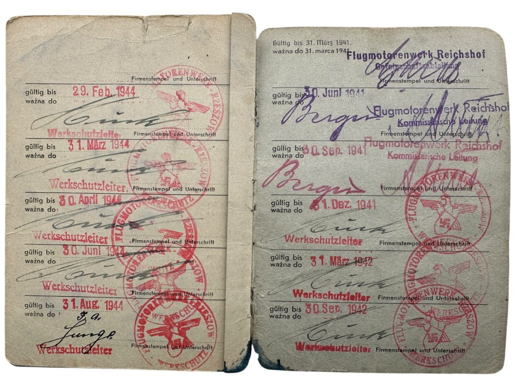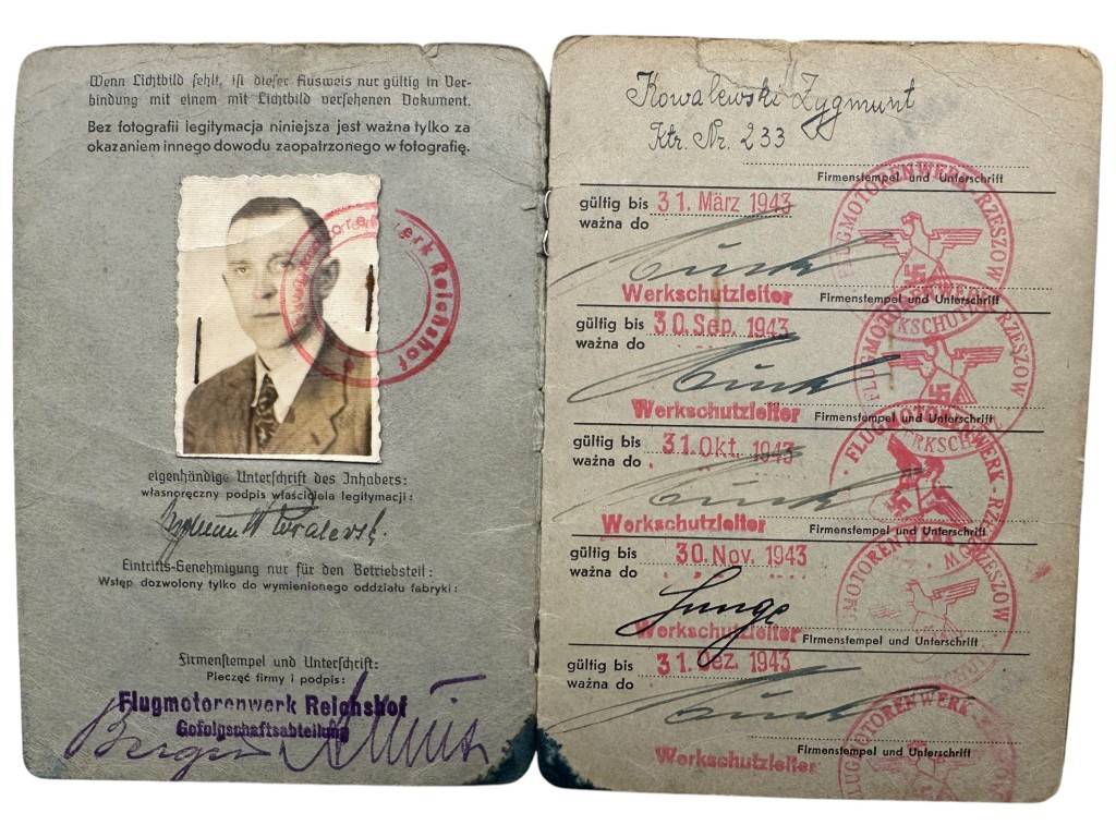 Original WWII German Werkschutz Ausweis Flugmotorenwerk Reichshof Rzeszów in Poland