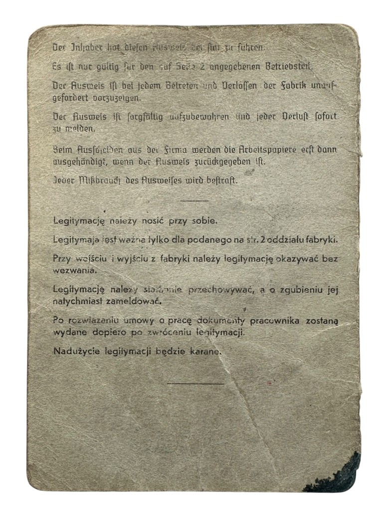 Zeldzaam persoonsgebonden legitimatiekaart uit de Duitse oorlogsindustrie in Polen.
