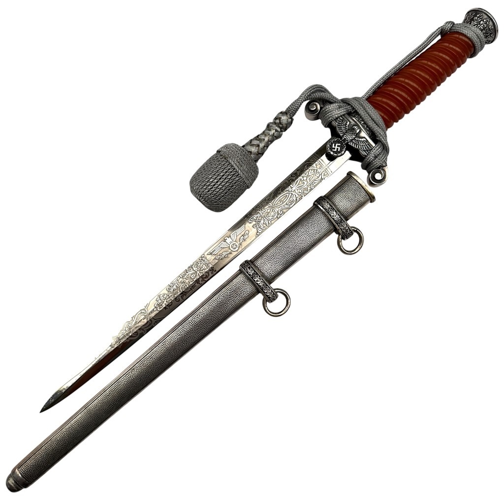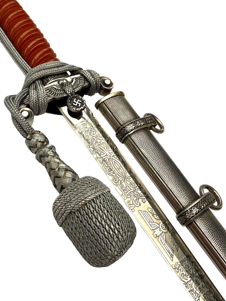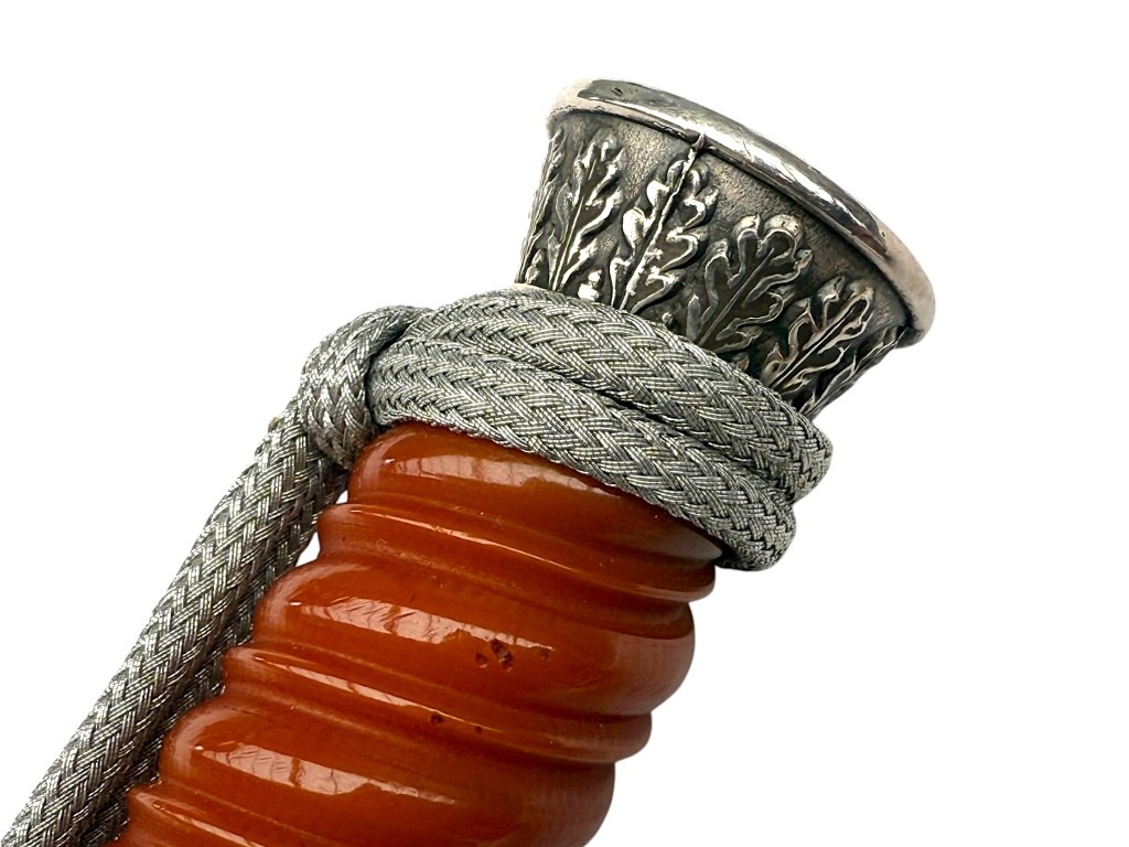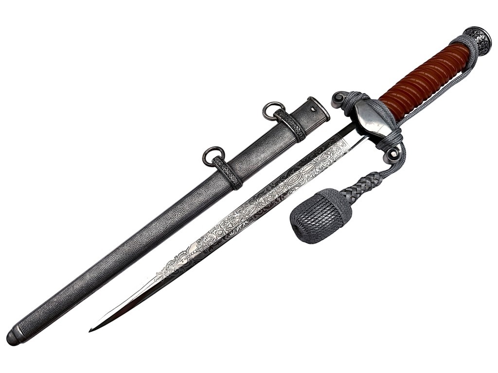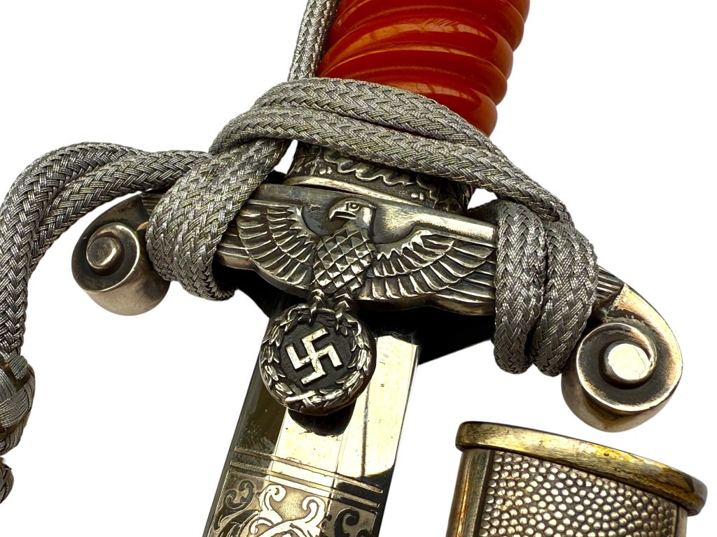 De pommel is rijk versierd met een eikenloofmotief en de kruisbeschermer toont de Wehrmacht adelaar met hakenkruis.