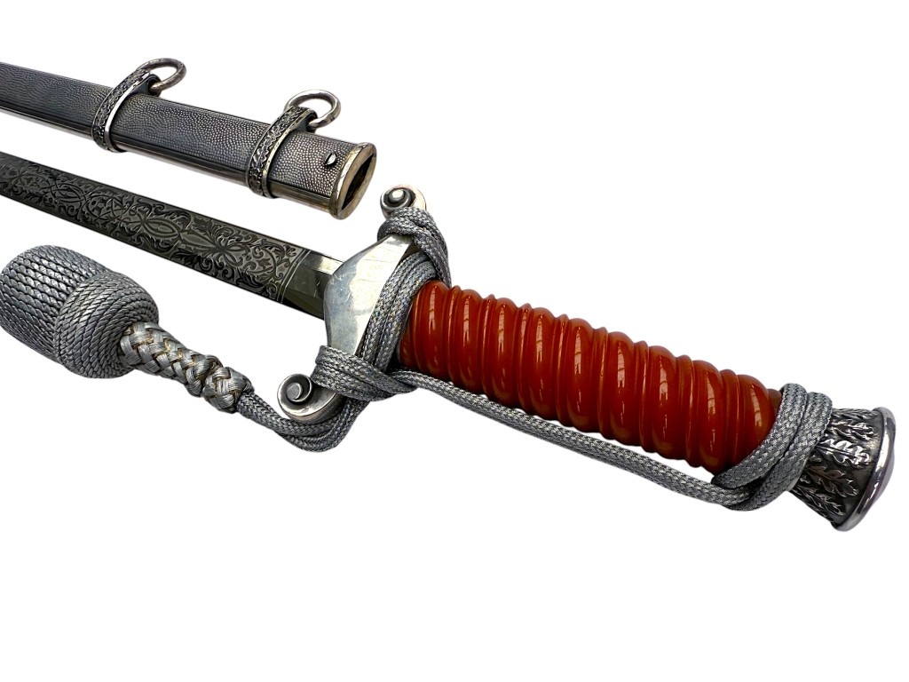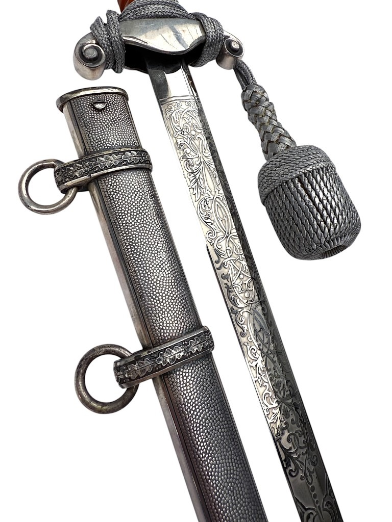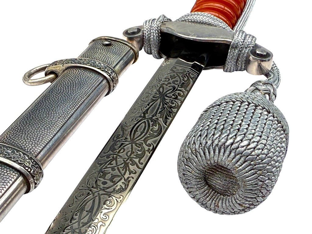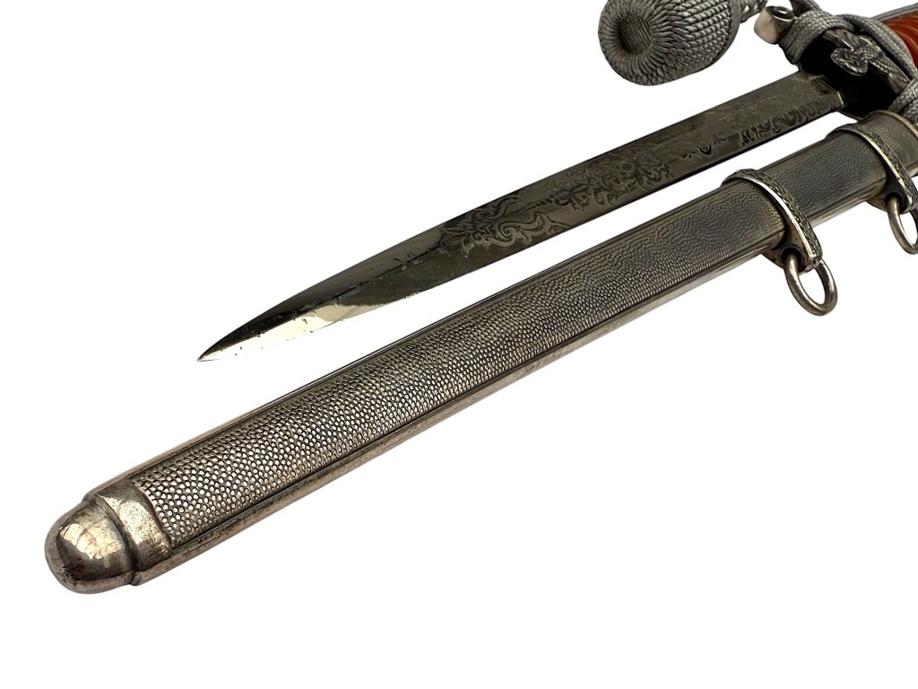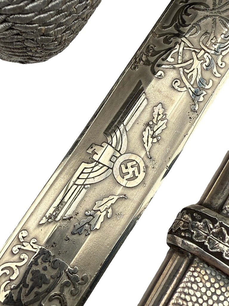 De kling is uitzonderlijk fraai geëtst met decoratieve florale motieven en een Wehrmacht adelaar, in de zeldzame Voos-stijl. De stalen schede heeft een donker geoxideerde afwerking met gedetailleerde banden en dubbele draagringen.