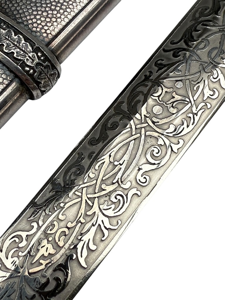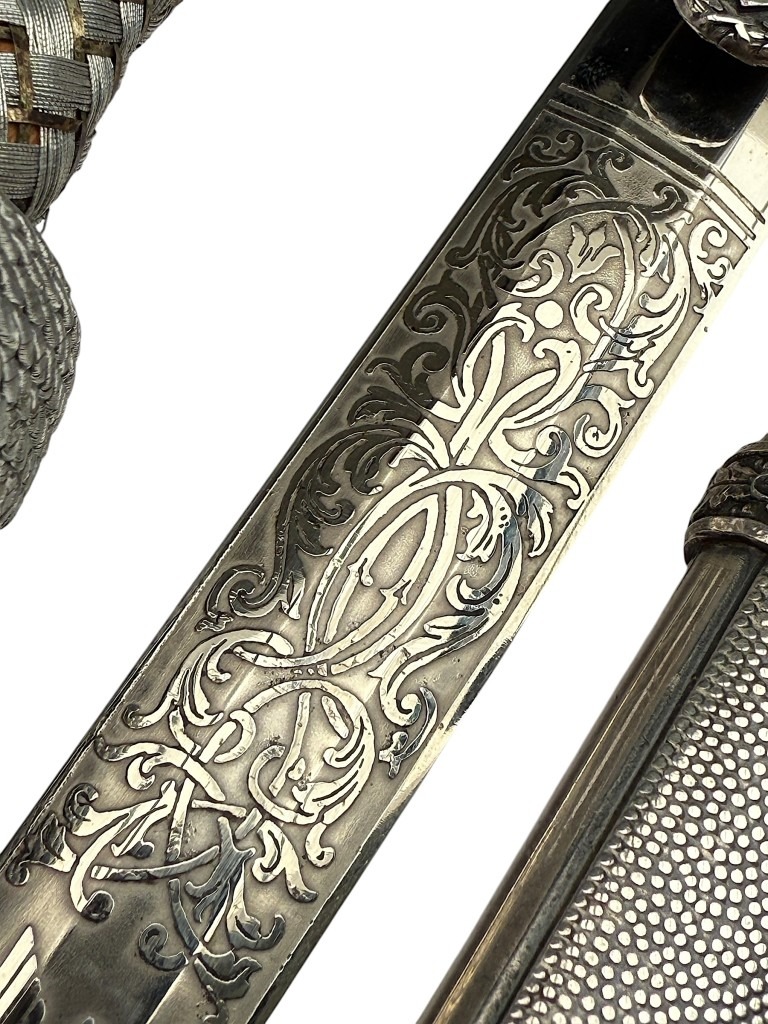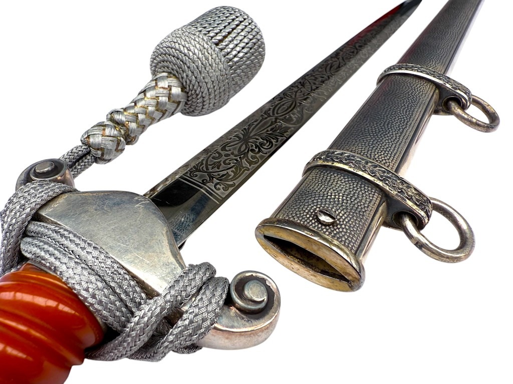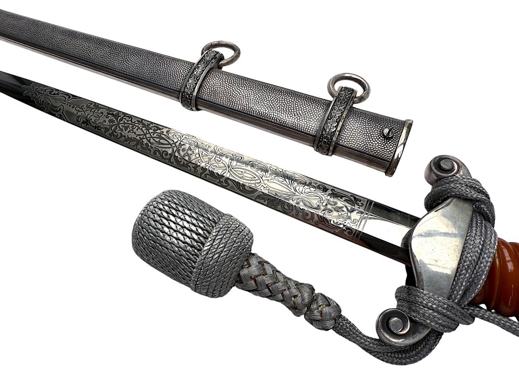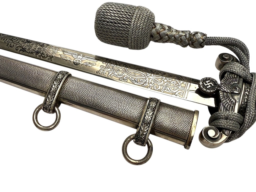 De kling is uitzonderlijk fraai geëtst met decoratieve florale motieven en een Wehrmacht adelaar, in de zeldzame Voos-stijl. De stalen schede heeft een donker geoxideerde afwerking met gedetailleerde banden en dubbele draagringen.
