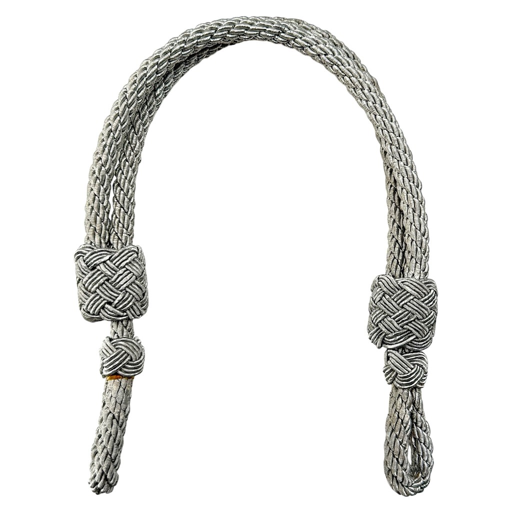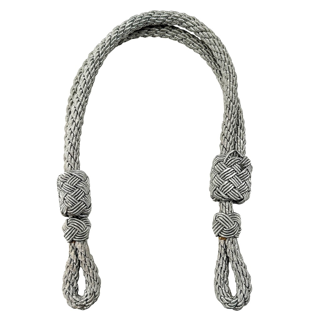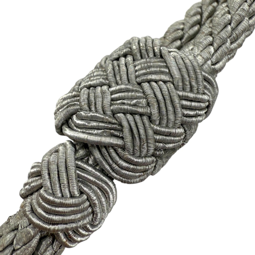 Het koord is vervaardigd uit stevig, gedetailleerd gevlochten metaaldraad en afgewerkt met decoratieve knopen in een complexe knooptechniek.