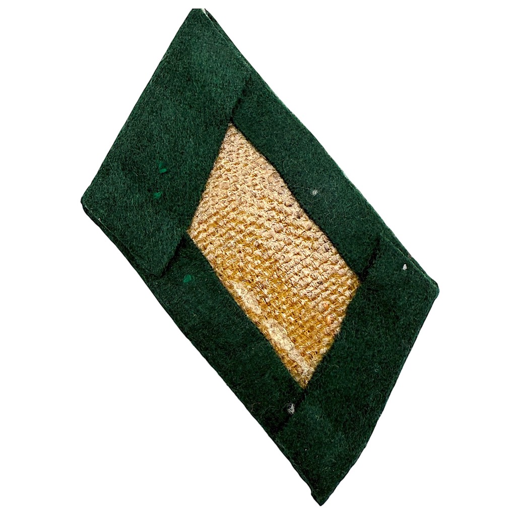 Deze Duitse Zollgrenzschutz kraagspiegel voor een Oberzollsekretär uit de Tweede Wereldoorlog is een fraai bewaard gebleven uniformonderdeel van de douanegrensbewaking. De donkergroene basis toont een rijk uitgevoerd zilverkleurig geborduurd lauwerbladmotief, omrand met een eveneens zilverkleurige chevronrand, kenmerkend voor de ranginsignes van hogere Zoll-functionarissen.