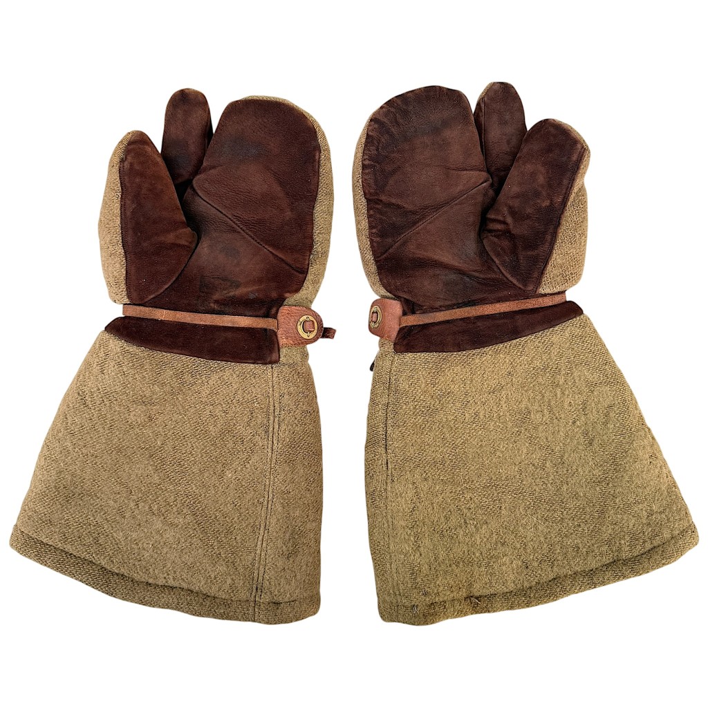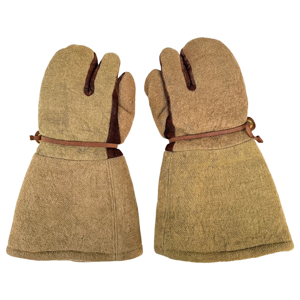 These winter gloves of the Imperial Japanese Army are an original pair from the Second World War, designed to withstand extremely cold conditions. They are made from thick, warm wool felt with leather reinforcements on the hand sections and feature adjustable leather straps for a secure fit.