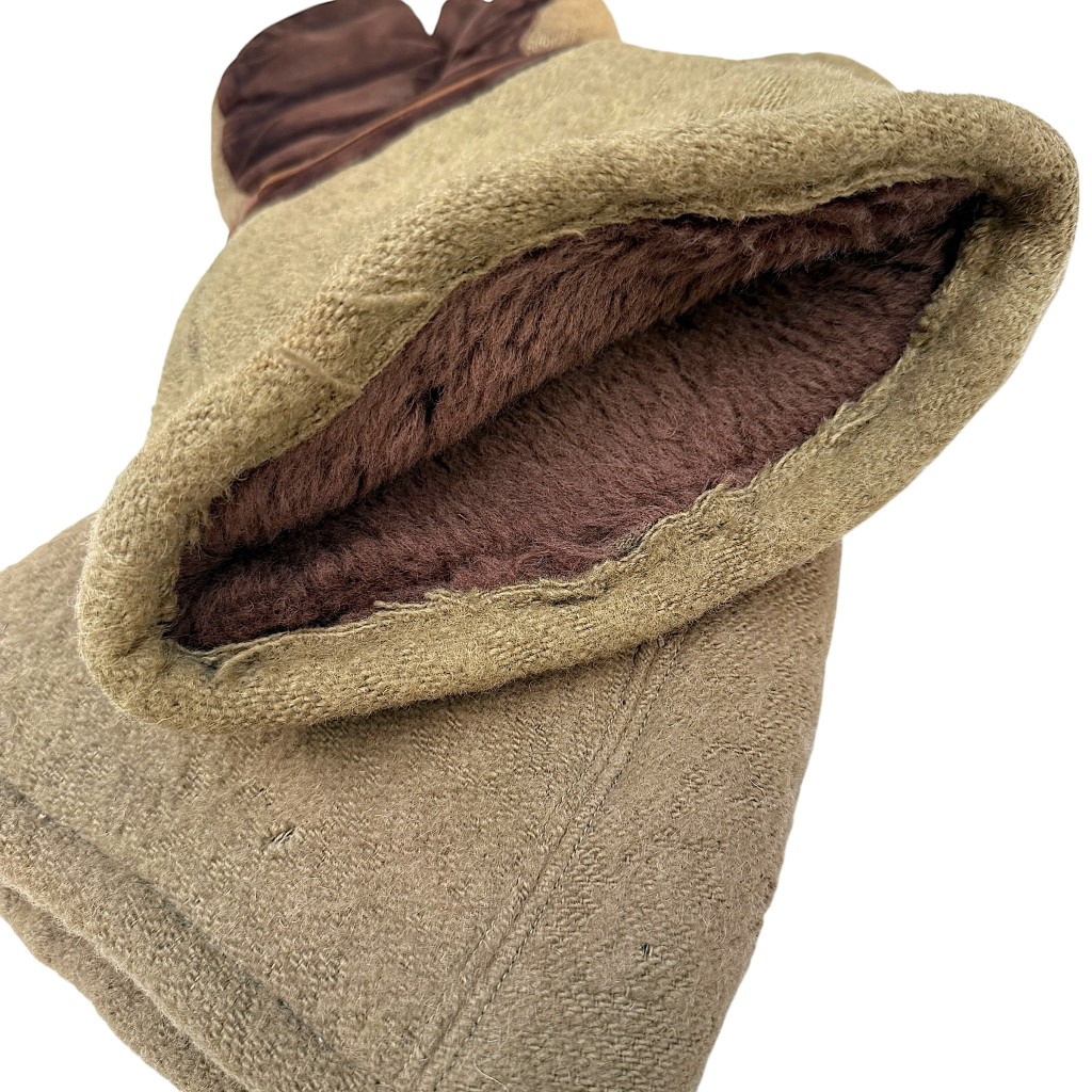 Deze winterhandschoenen van het Japanse Keizerlijke Leger zijn een origineel paar uit de Tweede Wereldoorlog en ontworpen om extreme koude omstandigheden te trotseren. Ze zijn vervaardigd uit dik, warm wolvilt met leren verstevigingen op de handsecties en beschikken over verstelbare leren riempjes voor een goede pasvorm. De binnenzijde is gevoerd met zachte, isolerende stof voor extra warmte. Het paar verkeert in nette, gebruikte staat met lichte ouderdomssporen.