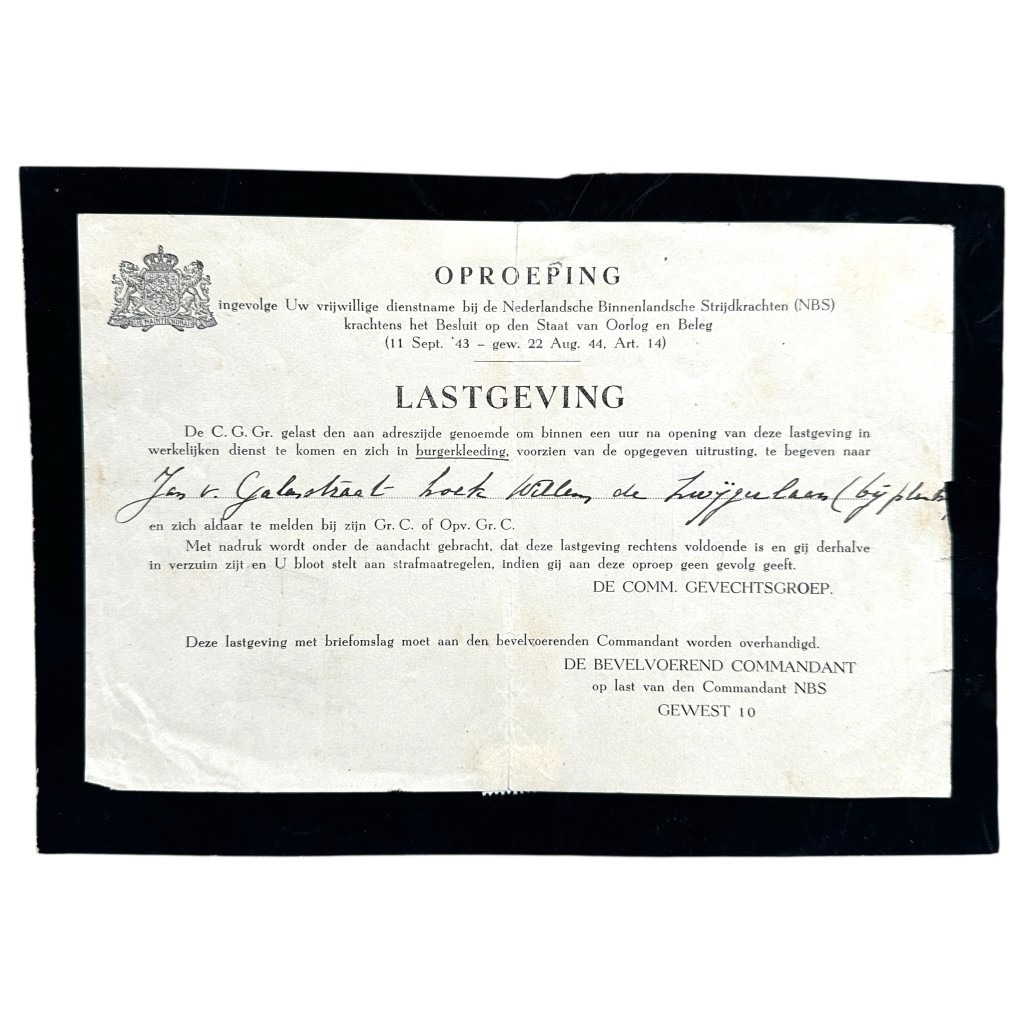 Dit Nederlandse Binnenlandse Strijdkrachten document is in goede conditie, bevestigd op een stuk karton en het NBS lid werd opgeroepen om zich te melden in burgerkleding naar de Jan van Galenstraat hoek Willem de Zwijgerlaan in Amsterdam.
