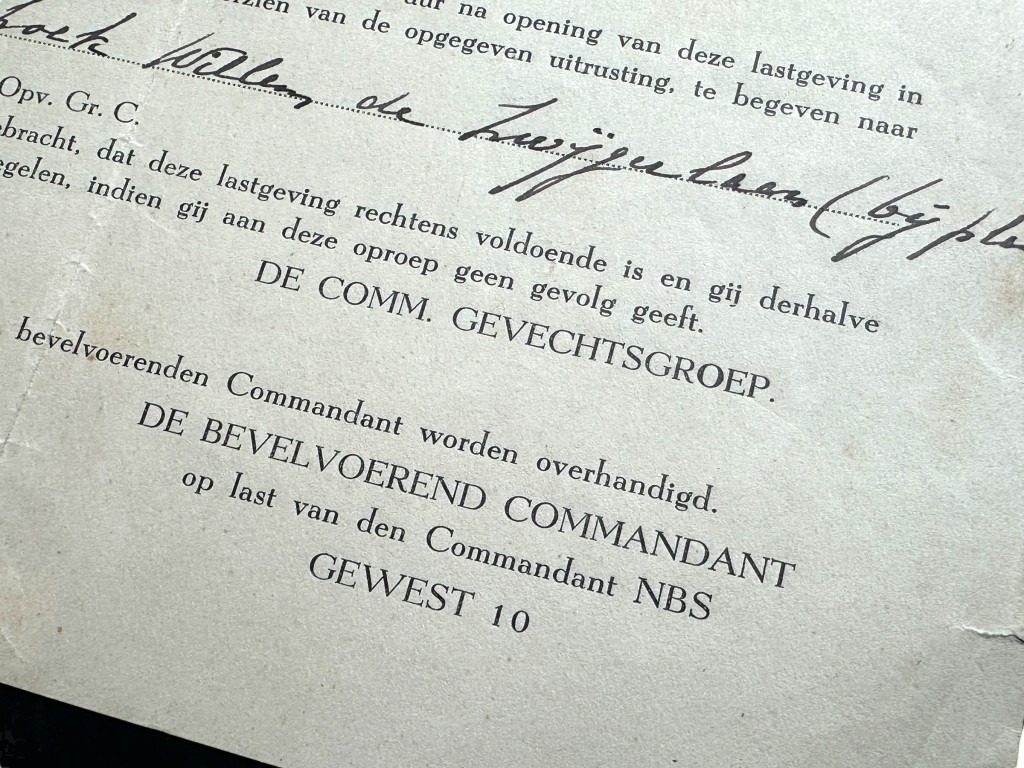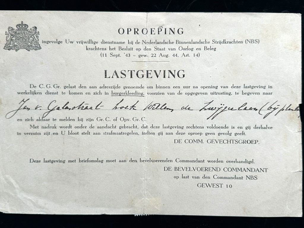 This Dutch Domestic Forces document is in good condition, attached to a piece of cardboard and the NBS member was summoned to report in civilian clothes to the Jan van Galenstraat corner Willem de Zwijgerlaan in Amsterdam.