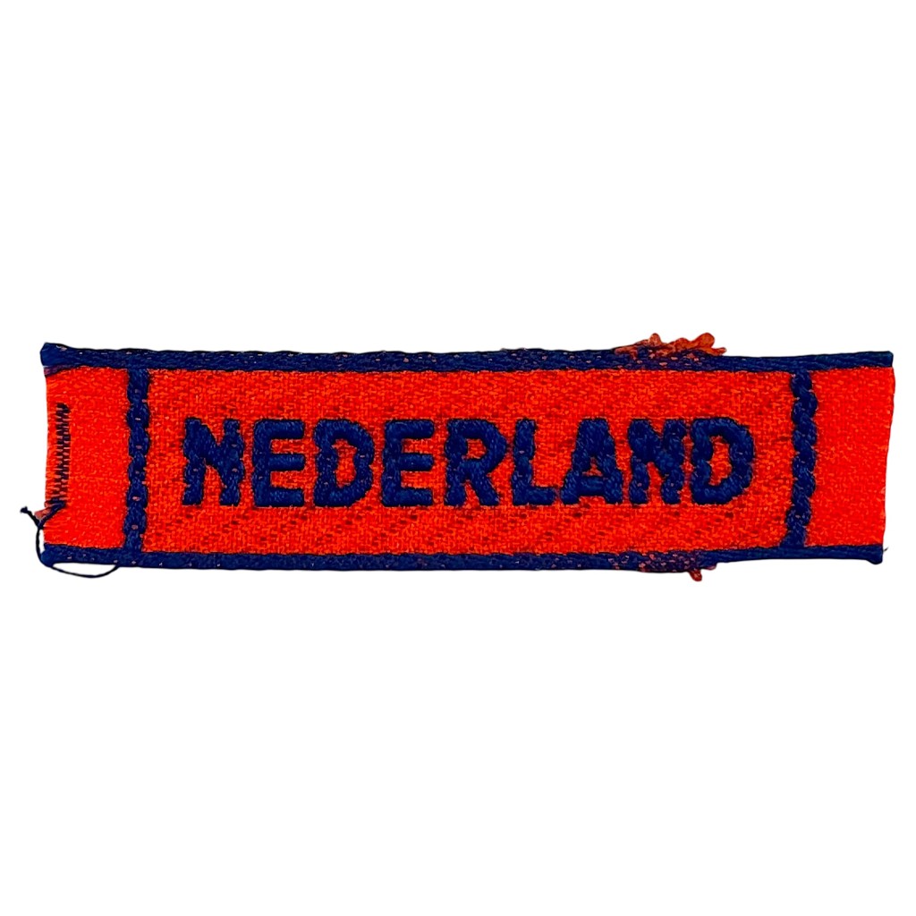 Het ‘Nederland’ embleem is in goede conditie, gemaakt van het zogenoemde Brabants weefsel en werd gedragen door de Binnenlandse Strijdkrachten.