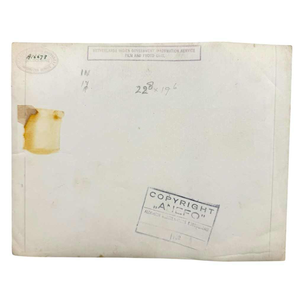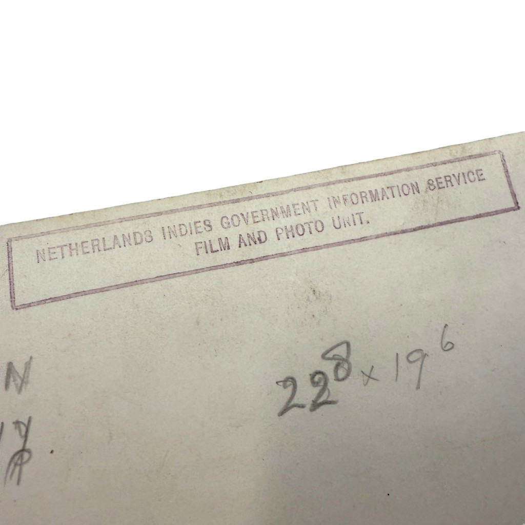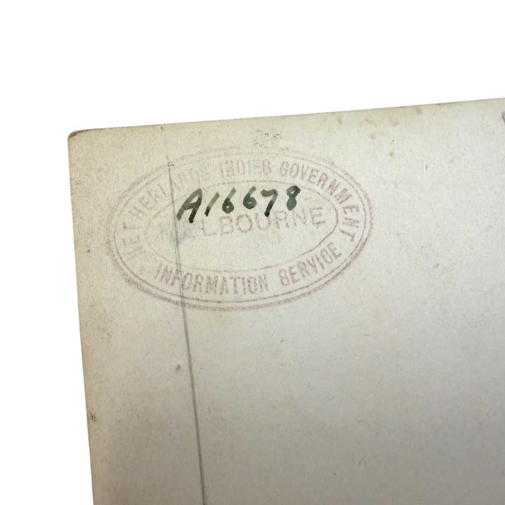 The reverse of the photograph bears stamps and annotations from the NIGIS Film and Photo Unit in Melbourne, Australia, confirming its provenance.