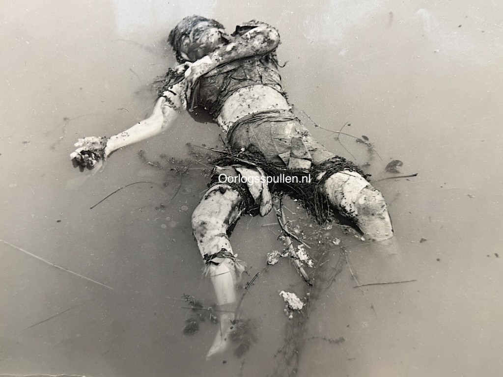 Originele zwart-witfoto uit de Tweede Wereldoorlog, vervaardigd door de Netherlands Indies Government Information Service (NIGIS), waarop het lichaam van een gesneuvelde Japanse soldaat te zien is, drijvend in ondiep water.