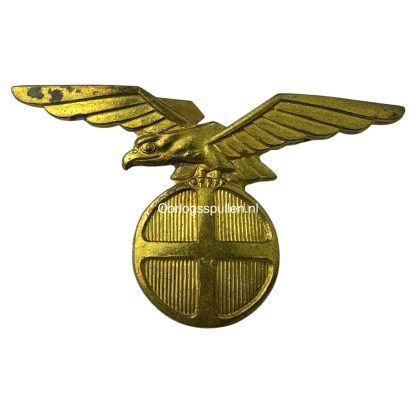 The eagle is executed in gold-colored metal and depicts a stylized eagle with wings spread, resting on an oval shield with the distinctive ribbed cross, the party’s official emblem.