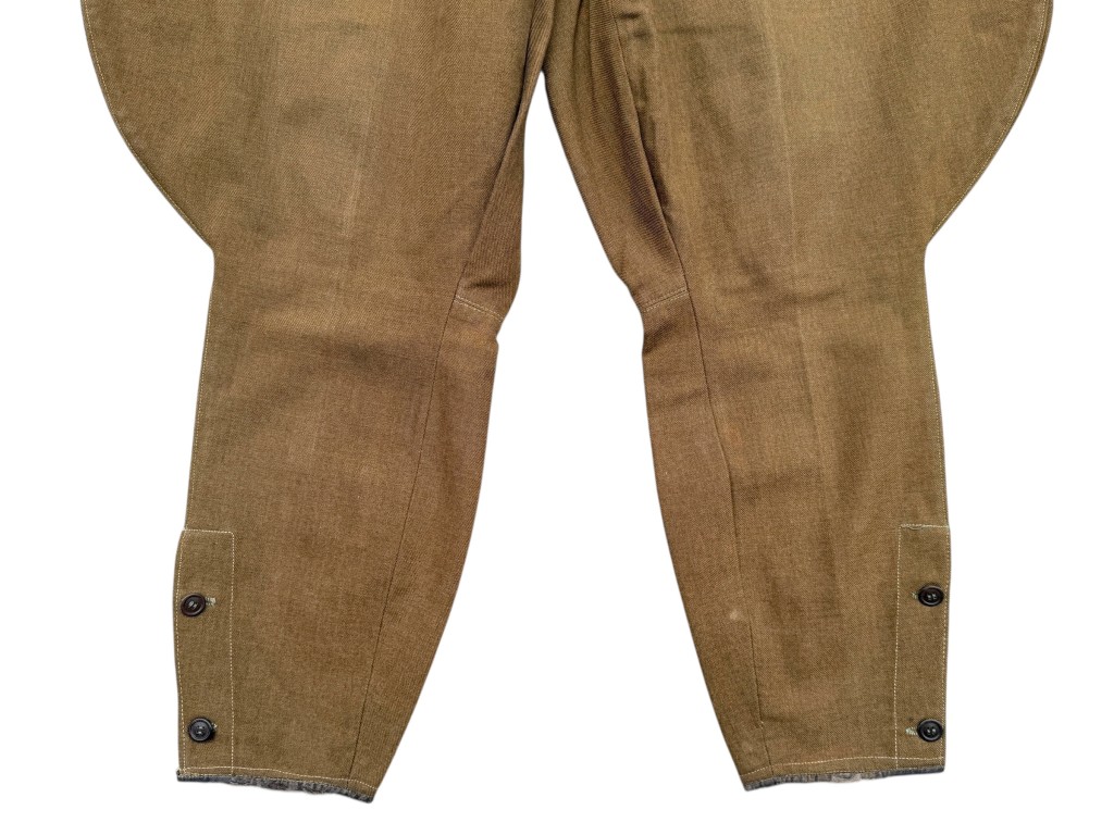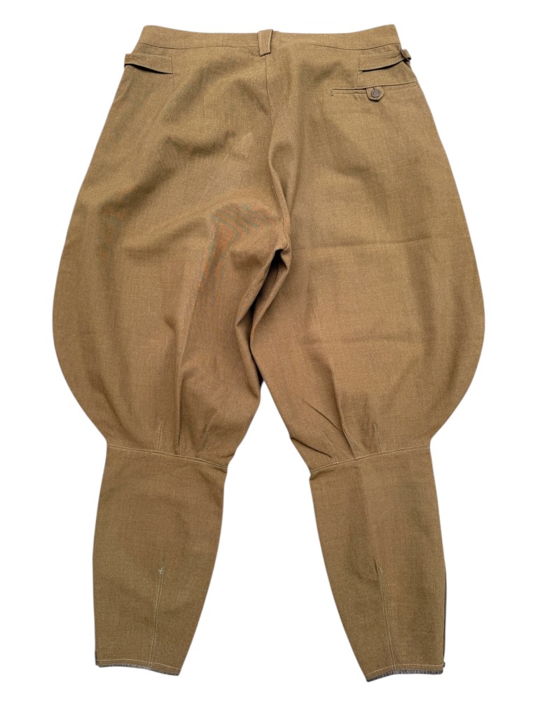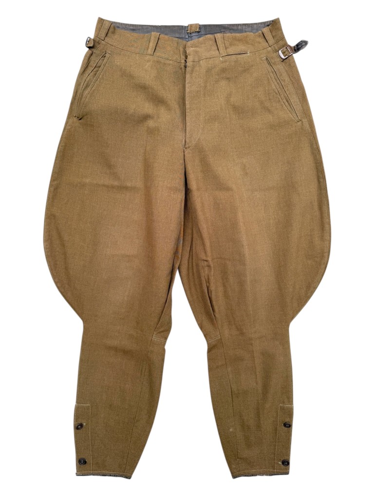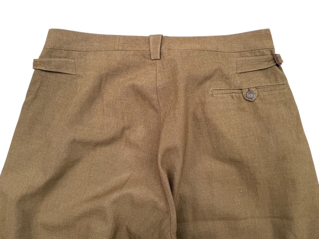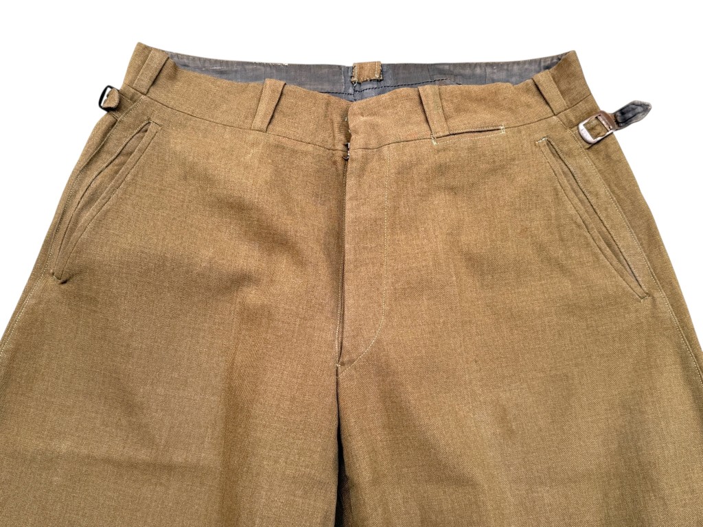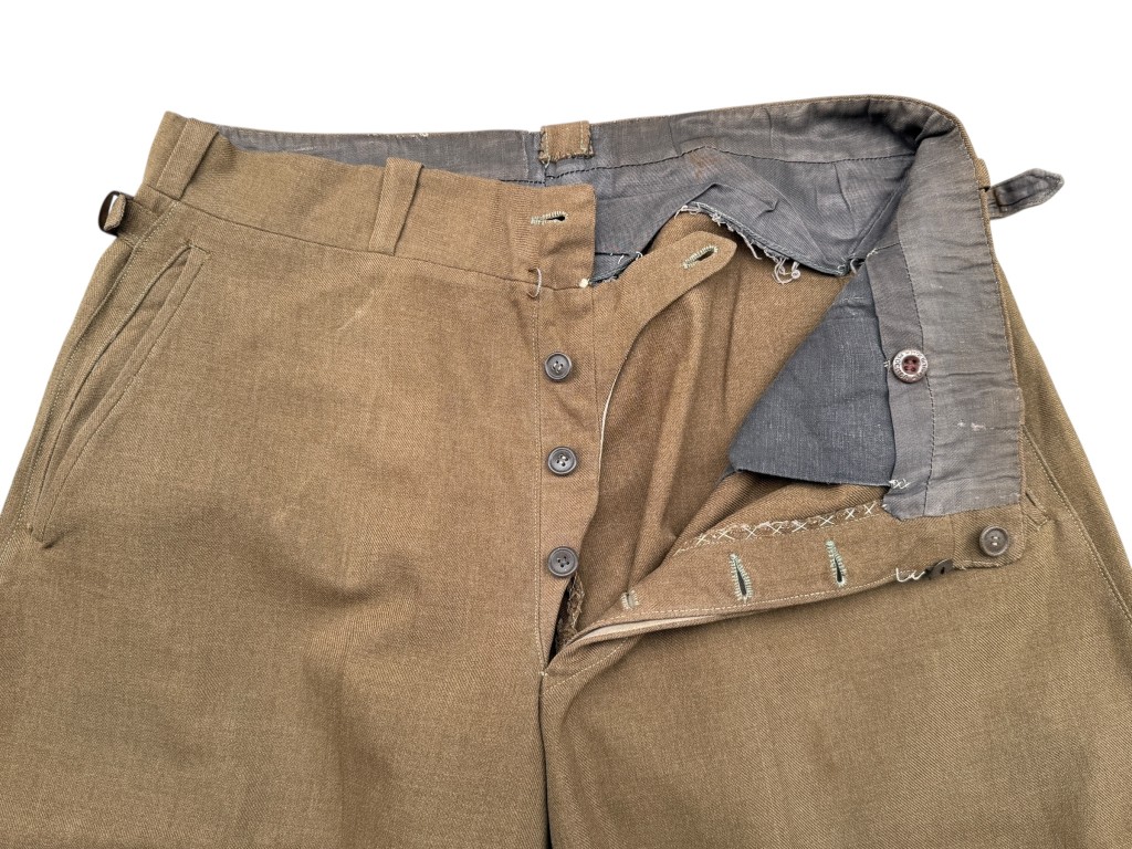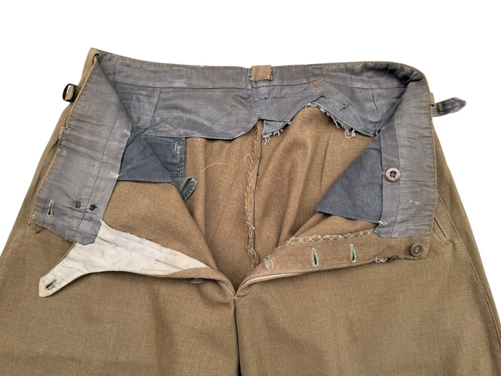 The trousers feature a classic high waist, reinforced fastening, and dark interior lining, with evident signs of hand-finishing typical of wartime manufacturing.