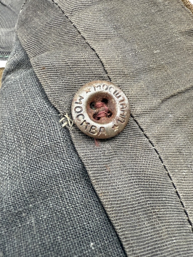 This particular set consists of the characteristic M43 tunic with standing collar and the typical riding-style trousers (sharovary), and is especially noteworthy because it is made from American Lend-Lease fabric—material supplied by the United States to the Soviet Union as part of the Allied aid program.