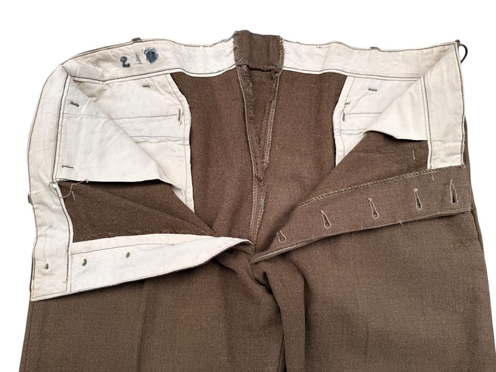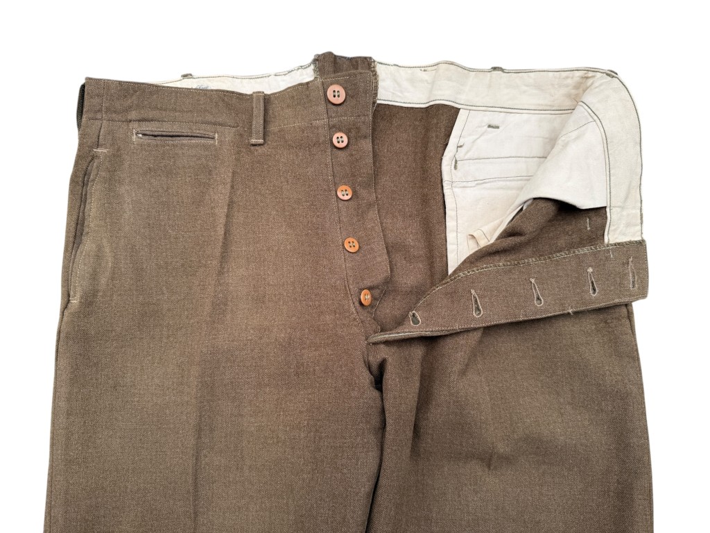 These U.S. Army Enlisted Men’s wool trousers are in very good condition and were part of the American uniform during the Second World War. The trousers are made of heavy, high-quality wool in an olive-brown shade and feature a classic button-fly closure. The original interior stamps are still visible.