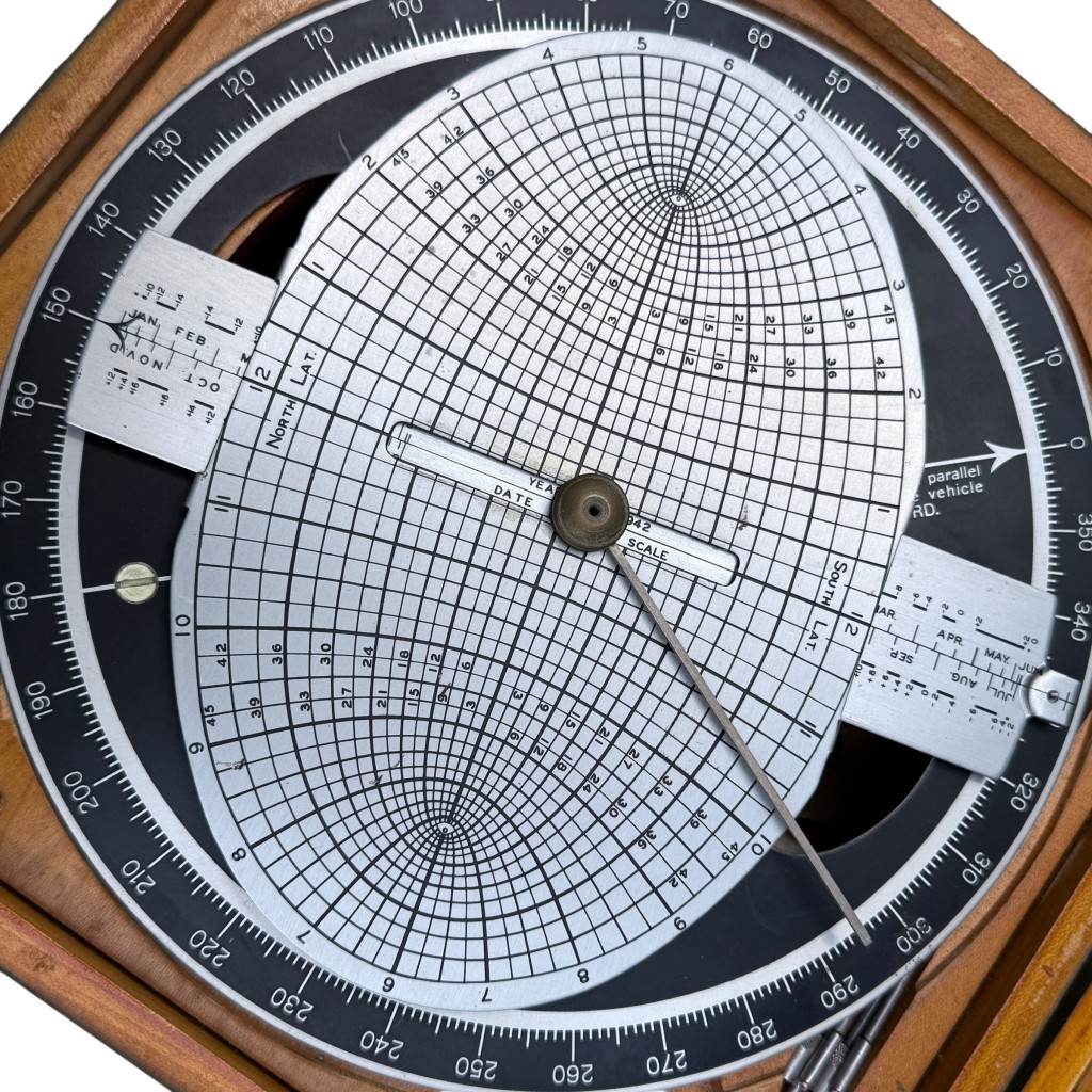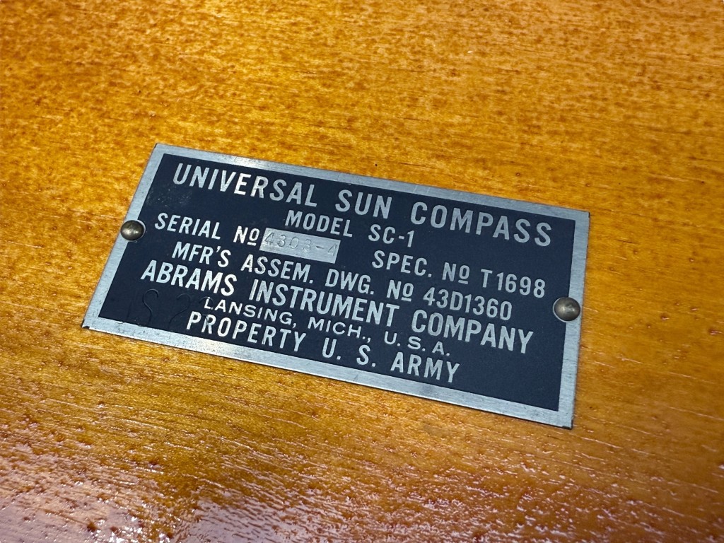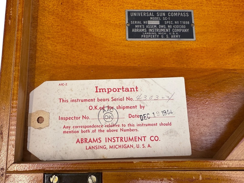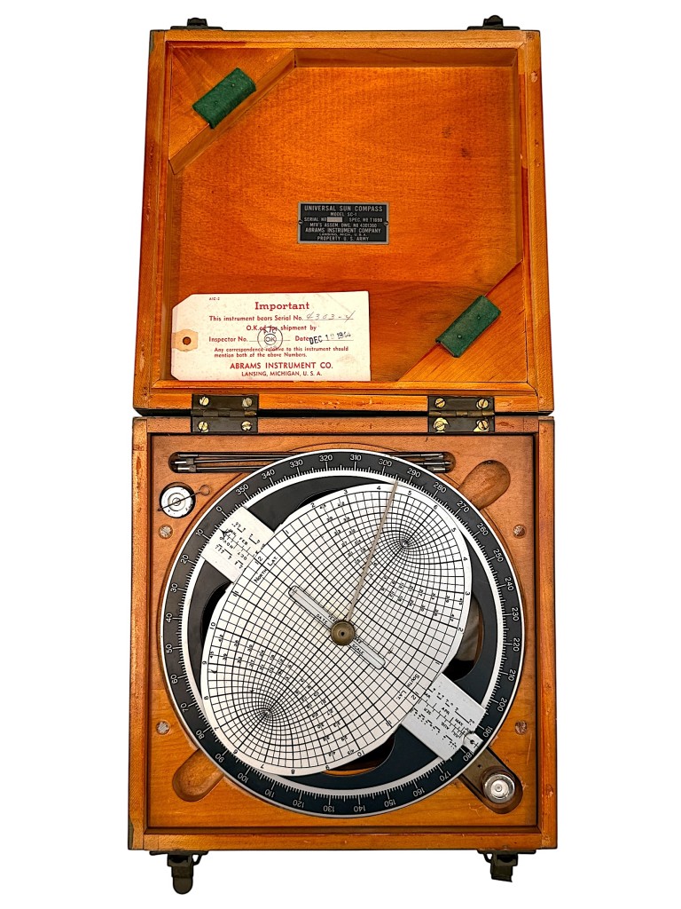 This U.S. Army Universal Sun Compass Model SC-1, produced by Abrams Instrument Co. and dated December 1944, is an exceptionally well-preserved navigation instrument from the Second World War.