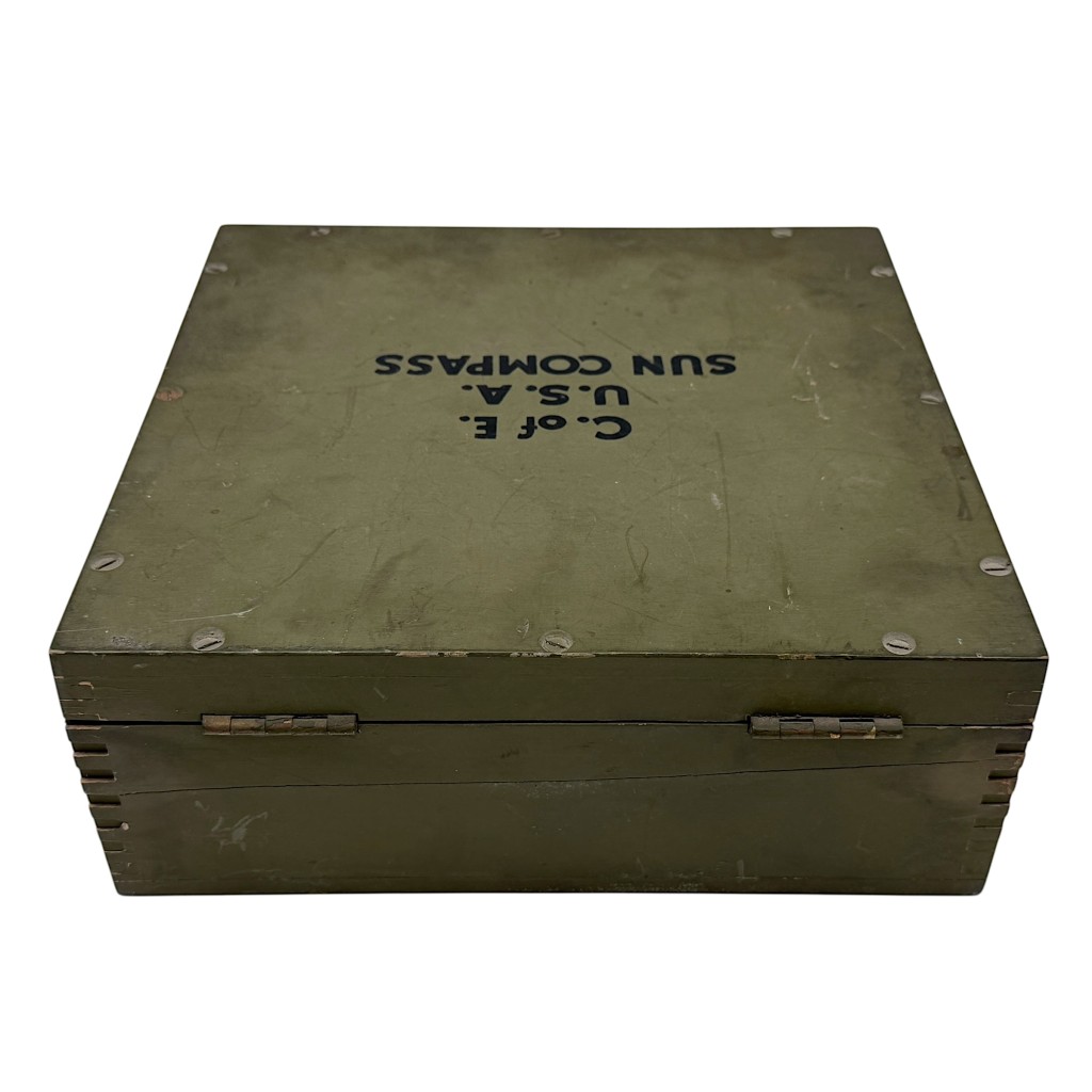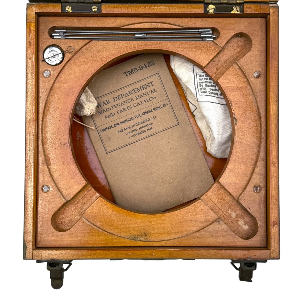 Dit U.S. Army Universal Sun Compass Model SC-1, geproduceerd door Abrams Instrument Co. en gedateerd december 1944, is een uitzonderlijk mooi bewaard navigatie-instrument uit de Tweede Wereldoorlog. De sun compass werd gebruikt in omstandigheden waar magnetische kompassen onbetrouwbaar waren, zoals in woestijngebieden of bij voertuigen met sterke magnetische interferentie. Het instrument zit in zijn vroege olijfgroene metalen transportkist én in de oorspronkelijke houten binnenkist met complete instrumentenset, inclusief het zeldzame onderhoudsmanual TM5-9422 uit 1943 en originele inspectietag met serienummer. De nauwkeurig gegraveerde schaalplaten, verstelmechanismen en het houten interieur verkeren in prachtige, authentieke staat met lichte gebruikssporen.