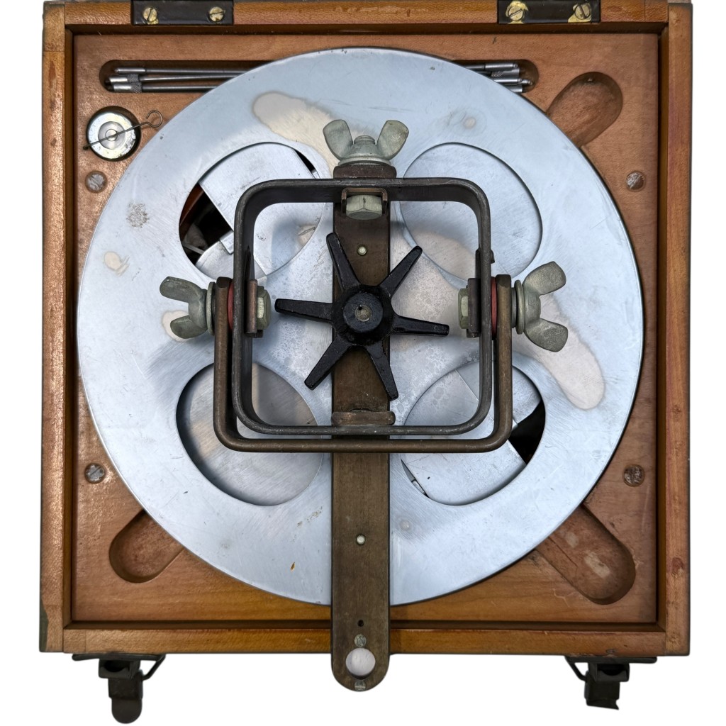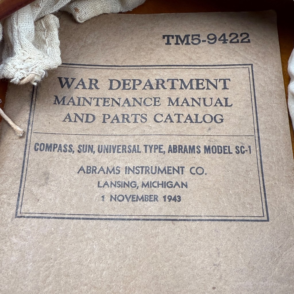 The instrument comes in its early olive-green metal transport case as well as the original wooden inner case with the complete instrument set, including the rare TM5-9422 maintenance manual from 1943 and the original inspection tag with serial number.