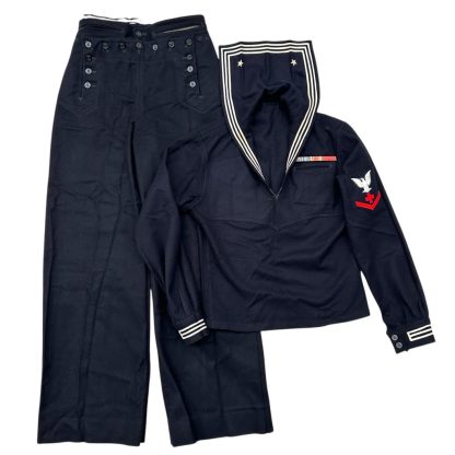 This dark blue US Navy uniform is in good condition, consists of the jumper and pants and was worn by an American sailor who worked as a pharmacist’s mate and who held the rank of Petty Officer third class.